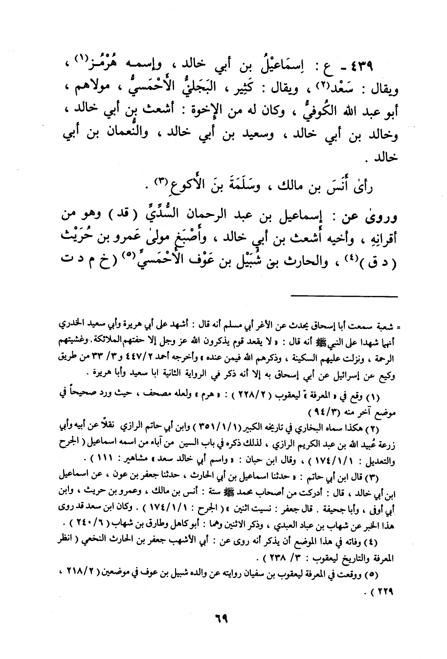(439) - ع: إِسماعيل بن أَبي خَالِد، واسمه هرمز (1) ، ويُقال: سعد (2) ، ويُقال: كثير، البجلي الأحمسي، مولاهم، أَبُو عَبْد اللَّهِ الكوفي، وكَانَ لَهُ من الأَخُوة: أشعث بْن أَبي خَالِد، وخالد بْن أَبي خَالِد، وسَعِيد بْن أَبي خَالِد، والنعمان بْن أَبي خَالِد.
