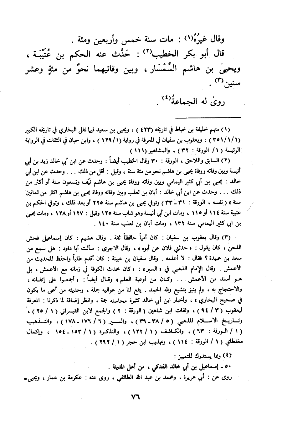 (2) السابق واللاحق، الورقة: 30 وَقَال الخطيب أيضا: وحدث عن ابن أَبي خالد زيد بن أَبي أنيسة وبين وفاته ووفاة يحيى بن هاشم نحو من مئة سنة، وقيل: أقل من ذلك ... وحدث عن ابن أَبي خالد: يحيى بن أَبي كثير اليمامي وبين وفاته ووفاة يحيى بن هاشم نيف وتسعون سنة أو أكثر من ذلك ... وحدث عن ابن أَبي خالد: أبان بن ثعلب وبين وفاته ووفاة يحيى بن هاشم أكثر من ثمانين سنة" (نفسه، الورقة: 31 - 33) وتوفي يحيى بن هاشم سنة 225 أو بعد ذلك، وتوفي الحكم بن عتيبة سنة 114 أو 115، ومات ابن أَبي أنيسة وهو شاب سنة 125 وقيل: 127 أو 128، ومات يحيى بن أَبي كثير اليمامي سنة 132، ومات أبان بن ثعلب سنة 140.