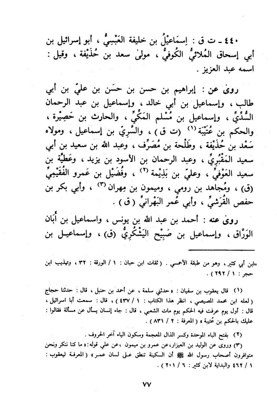 (440) - ت ق: إِسْمَاعِيل بن خليفة العبسي، أَبُو إسرائيل بن أَبي إِسْحَاق الملائي الكوفي، مولى سعد بْن حذيفة، وقيل: اسمه عبد العزيز.