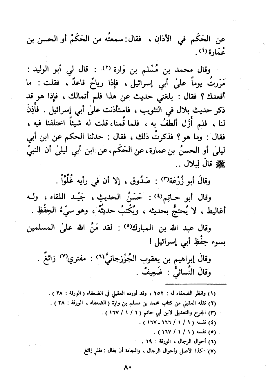 وَقَال عَبد اللَّهِ بْن المبارك (5) : لقد من اللَّه على المسلمين بسوء حفظ أبي إسرائيل!