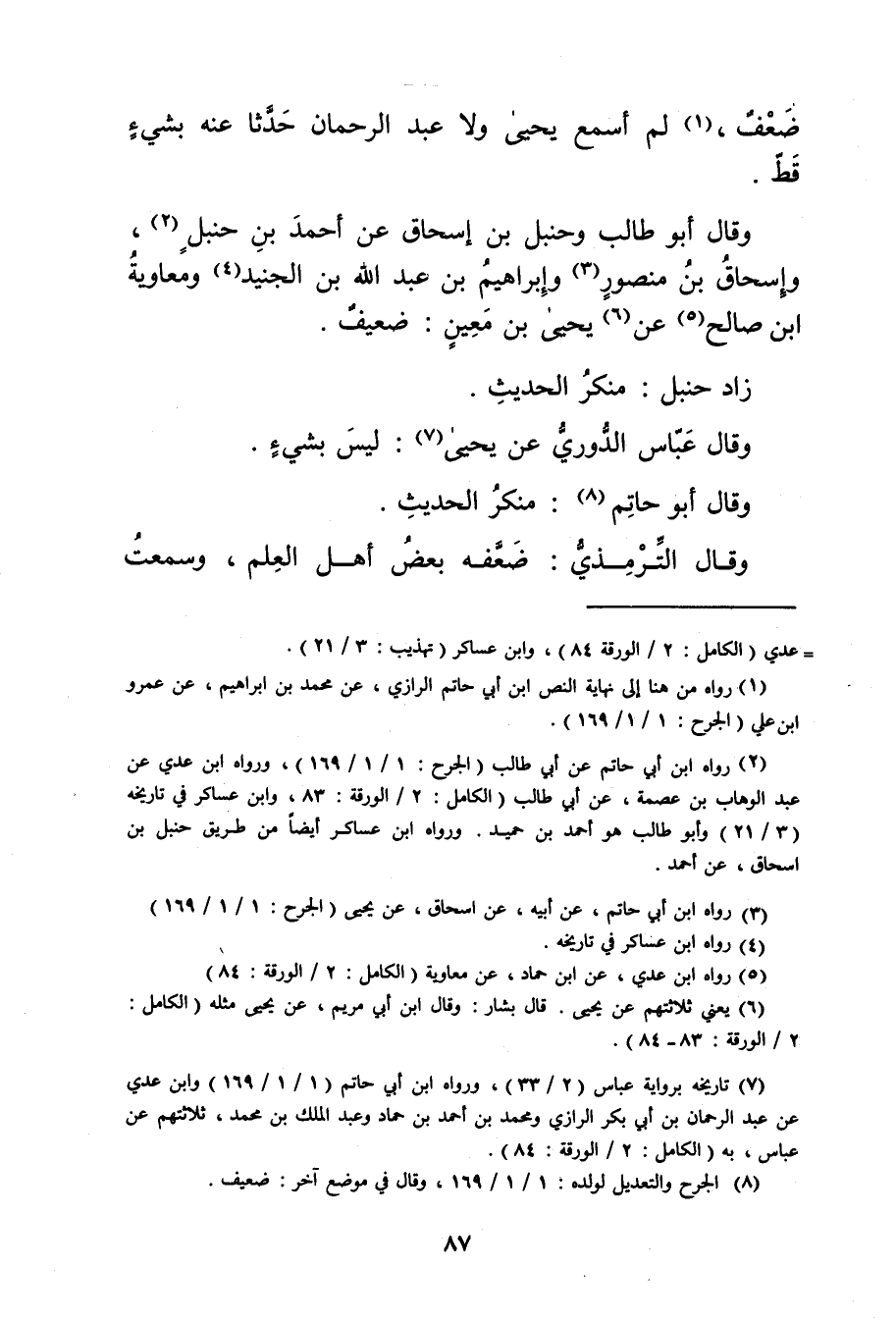 (2) رواه ابْن أَبي حاتم عَن أبي طالب (الجرح: 1 / 1 / 169) ، ورواه ابن عدي عن عبد الوهاب بن عصمة، عَن أبي طالب (الكامل: 2 / الورقة: 83، وابن عساكر في تاريخه (3 / 21) وأبو طالب هو أحمد بن حميد. ورواه ابن عساكر أيضا من طريق حنبل بن إسحاق، عن أحمد.