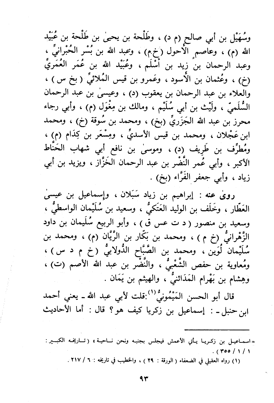 = إِسماعيل بن زكريا يأتي الأعمش فيجلس بجنبه ونحن ناحية" (تاريخه الكبير: 1 / 1 / 355) .