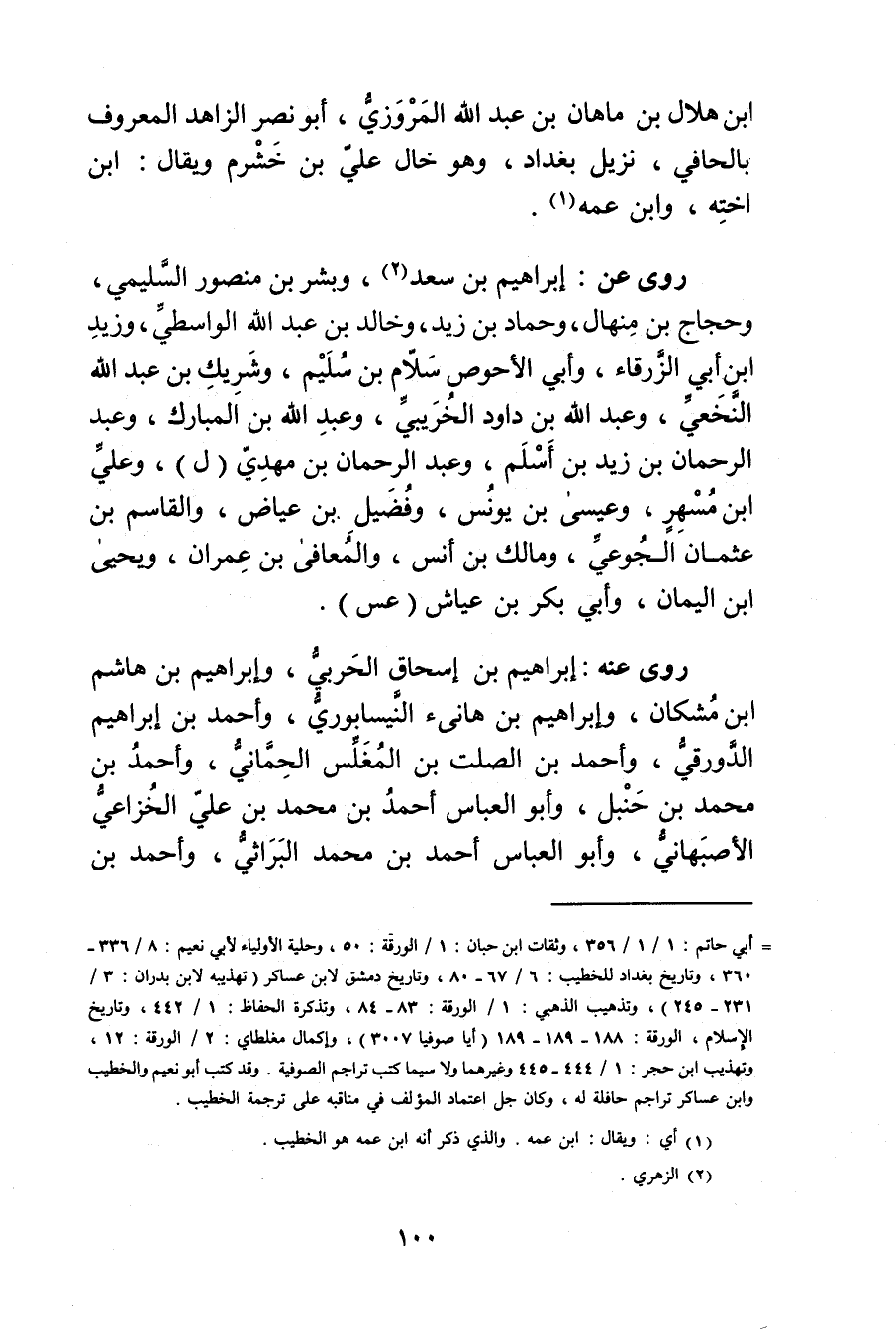 = أبي حاتم: 1 / 1 / 356، وثقات ابن حبان: 1 / الورقة: 50، وحلية الاولياء لابي نعيم: 8 / 336 - 360، وتاريخ بغداد للخطيب: 6 / 67 - 80، وتاريخ دمشق لابن عساكر (تهذيبه لابن بدران: 3 / 231 - 245) ، وتذهيب الذهبي: 1 / الورقة: 83 - 84، وتذكرة الحفاظ: 1 / 442، وتاريخ الاسلام، الورقة: 188 - 189 - 189 (أيا صوفيا 3007) ، وإكمال مغلطاي: 2 / الورقة: 12، وتهذيب ابن حجر: 1 / 444 - 445 وغيرهما ولا سيما كتب تراجم الصوفية.