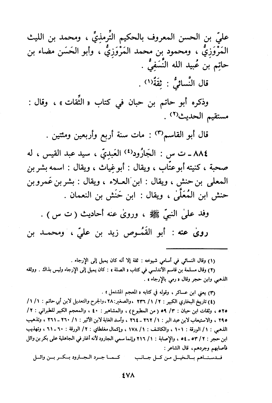(4) تاريخ البخاري الكبير: 2 / 1 / 236، والصغير: 28، والجرح والتعديل لابن أَبي حاتم: 1 / 1 / 525، وثقات ابن حبان: 3 / 59 (من المطبوع) ، والمشاهير: 40، والمعجم الكبير للطبراني: 2 / 295، والاستيعاب لابن عَبد الْبَرِّ: 1 / 262 - 264، وأسد الغابة لابن الاثير: 1 / 260 - 261، وتذهيب الذهبي: 1 / الورقة: 101، والكاشف: 1 / 178، وإكمال مغلطاي: 2 / الورقة: 60 - 61، وتهذيب ابن حجر: 2 / 53 - 54، والاصابة: 1 / 216 وإنما سمي الجارود لانه أغار في الجاهلية على بكر بن وائل فأصابهم وجردهم، قال الشاعر: