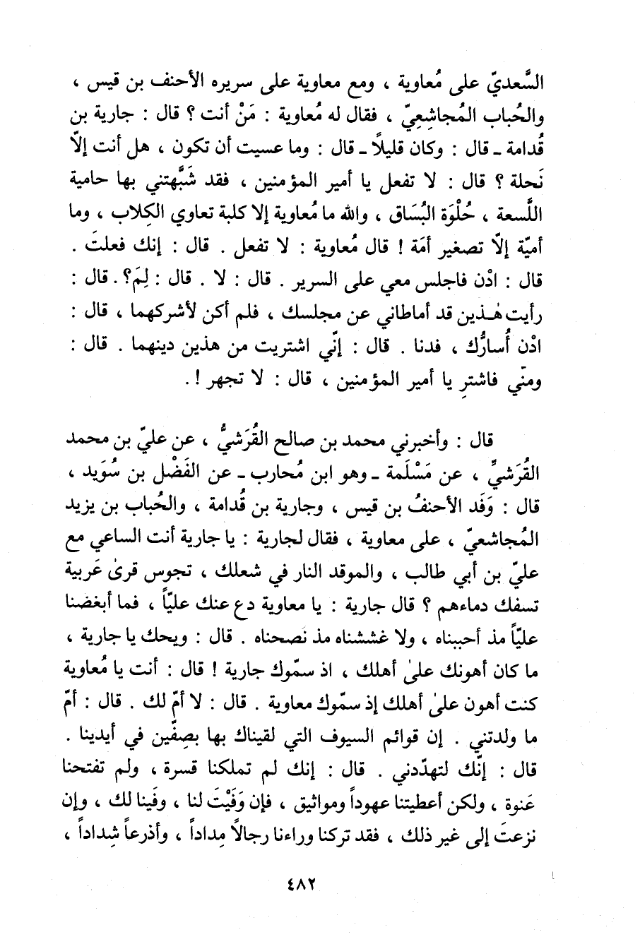 قال: وأَخْبَرَنِي مُحَمَّد بْن صالح القرشي، عَنْ عَلِيّ بْن مُحَمَّدٍ القرشي، عَنْ مسلمة - وهو ابن محارب، عَن الفضل بْن سويد، قال، وفد الأَحنف بْن قيس، وجارية بْن قدامة، والحباب بْن يزيد المجاشعي، عَلَى معاوية، فقَالَ لجارية: يا جارية أنت الساعي مع عَلِيّ بْن أَبي طالب، والموقد النار فِي شعلك، تجوس قرى عربية تسفك دماءهم؟ قال جارية: يا معاوية دع عنك عليا، فما أبغضنا عليا مذ أحببناه، ولا غششناه مذ نصحناه. قال: ويحك يا جارية، ما كان أهونك عَلَى أهلك، إذ سموك جارية! قال: أنت يا معاوية كنت أهون عَلَى أهلك إذ سموك معاوية. قال: لا أم لك. قال: أم ما ولدتني. إن قوائم السيوف التي لقيناك بها بصفين فِي أيدينا. قال: إنك لتهددني. قال: أنك لم تملكنا قسرة، ولم تفتحنا عنوة، ولكن أعطيتنا عهودا ومواثيق، فإن وفيت لنا، وفينا لك، وان نزعت إِلَى غير ذلك، فقد تركنا وراءنا رجالا مدادا، وأذرعا شدادا،