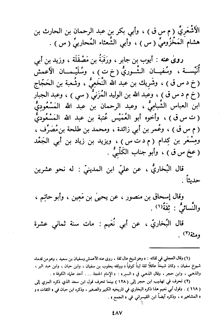 (2) تحرف في تهذيب ابن حجر إلى (128) بينما تحرف قول ابن سعد الذي ذكره المزي إلى (118) . وقول أبي نعيم هذا ذكره البخاري في تاريخية الكبير والصغير، وذكره ابنُ حِبَّان في "الثقات" و"المشاهير"، وذكره أيضا ابن القيسراني في "الجمع".