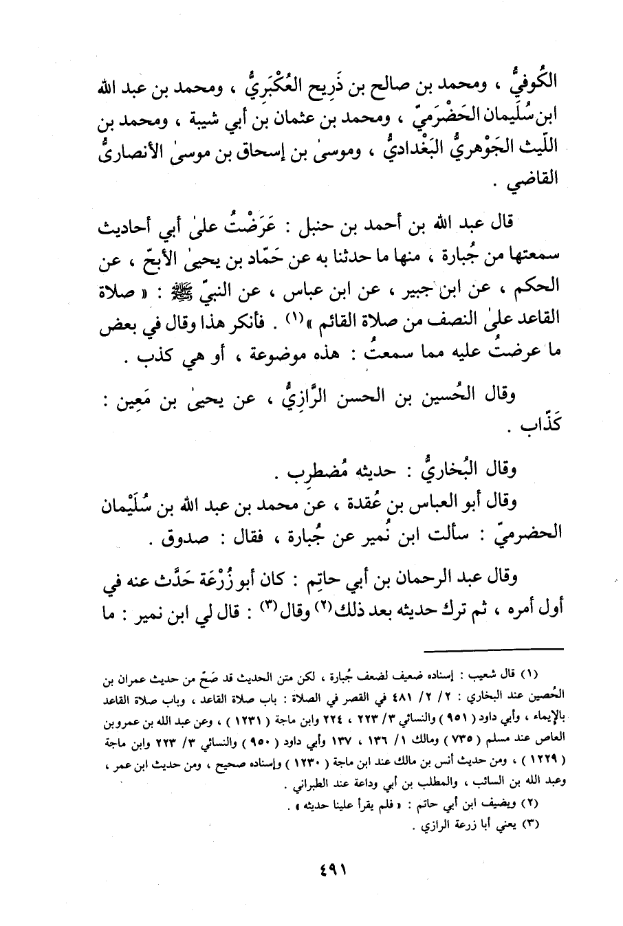 قال عَبْد اللَّهِ بْن أَحْمَدَ بْن حنبل: عرضت عَلَى أبى أحاديث سمعتها من جبارة، منها ما حَدَّثَنَا بِهِ عَنْ حماد بْن يَحْيَى الأبح، عَنِ الحكم، عَنِ ابن جبير، عَنِ ابْنِ عَبَّاسٍ، عَنِ النَّبِيِّ صَلَّى اللَّهُ عَلَيْهِ وسَلَّمَ: صلاة القاعد عَلَى النصف من صلاة القائم" (1) . فأنكر هذا وَقَال فِي بعض ما عرضت عليه مما سمعت: هذه موضوعة، أو هي كذب.