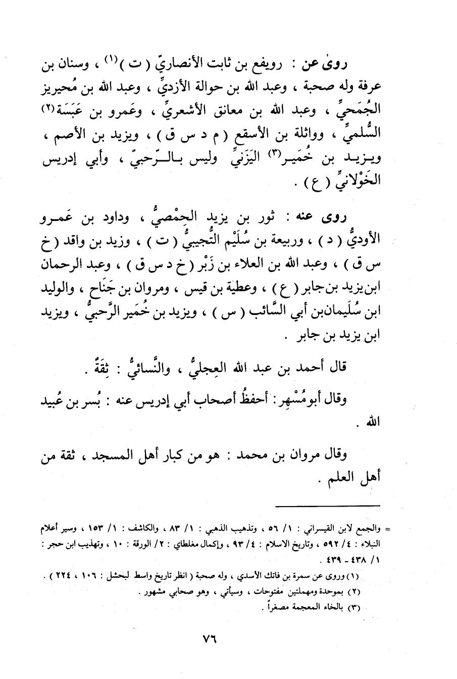 = والجمع لابن القيسراني: 1 / 56 وتذهب الذهبي: 1 / 83 والكشاف: 1 / 153 وسير أعلام النبلاء: 4 / 692، وتاريخ الاسلام: 4 / 93، وإكمال مغلطاي: 2 / الورقة: 10 وتهذيب ابن حجر: 1 / 438 - 439.