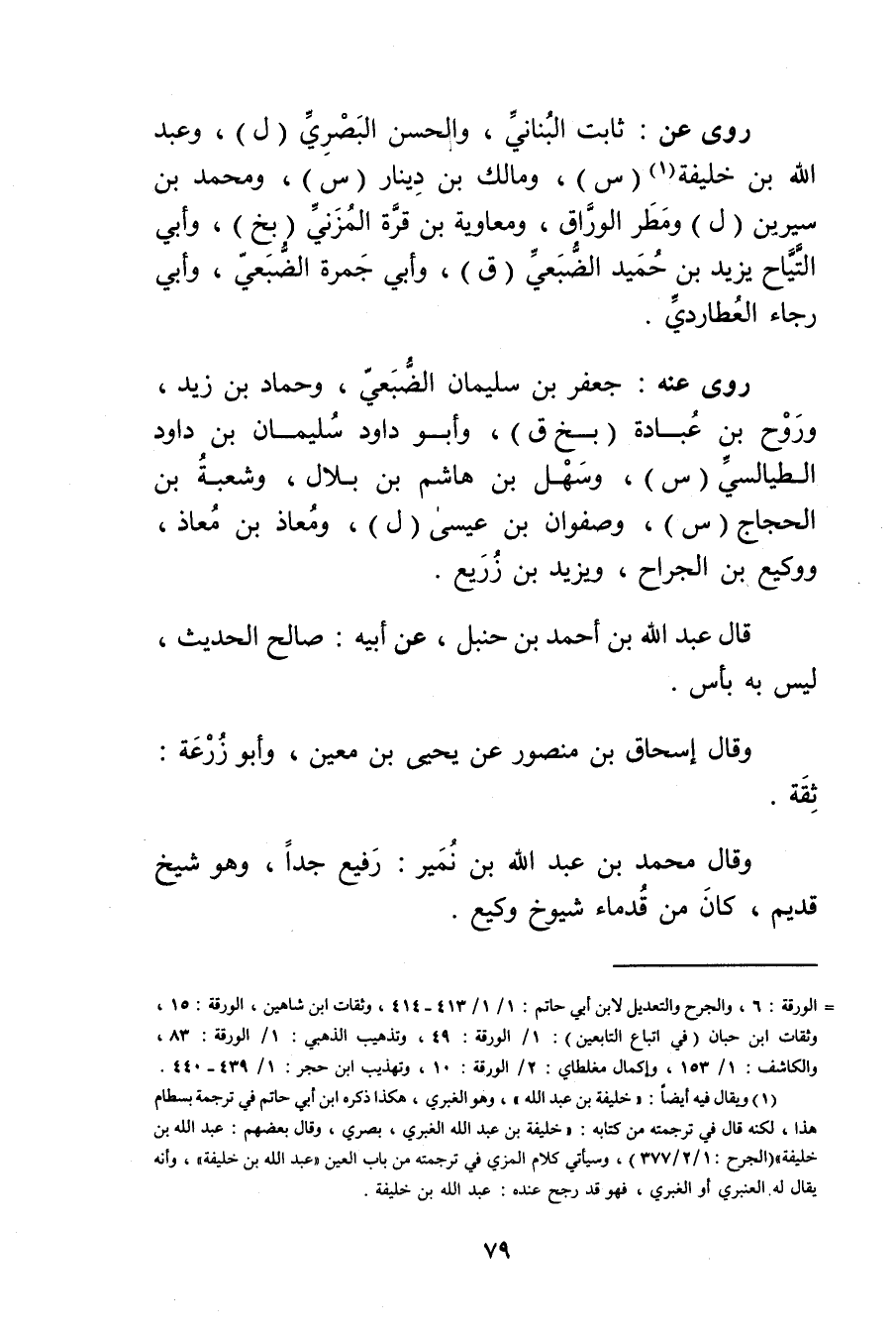 (1) ويُقال فيه أيضا: خليفة بن عبد الله"، وهو الغبري، هكذا ذكره ابن أَبي حاتم في ترجمة بسطام هذا، لكنه قال في ترجمته من كتابه: خليفة بن عبد الله الغبري، بصري، وَقَال بعضهم: عَبْد اللَّهِ بن خليفة" (الجرح: 1 / 2 / 377) ، وسيأتي كلام المزي في ترجمته من باب العين"عبد الله بن خليفة"، وأنه يقال له العنبري أو الغبري، فهو قد رجح عنده: عبد الله بن خليفة.
