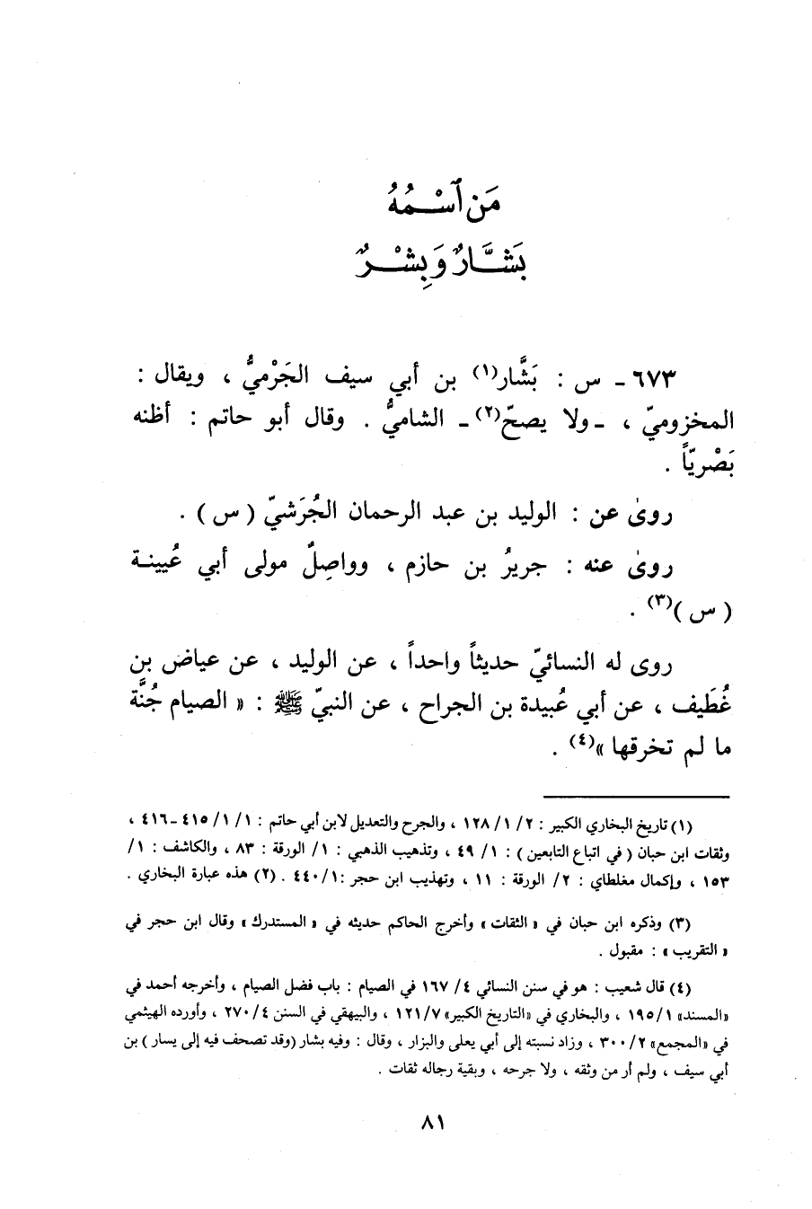 (4) قال شعيب: هو في سنن النَّسَائي 4 / 167 في الصيام: باب فضل الصيام، وأخرجه أحمد في "المسند"1 / 195، والبخاري في "التاريخ الكبير"7 / 121، والبيهقي في السنن 4 / 270، وأورده الهيثمي في "المجمع"2 / 300، وزاد نسبته إلى أبي يَعْلَى والبزار، وَقَال: وفيه بشار (وقد تصحف فيه إلى يسار) بن أَبي سيف، ولم أر من وثقه. ولا جرحه، وبقية رجاله ثقات.