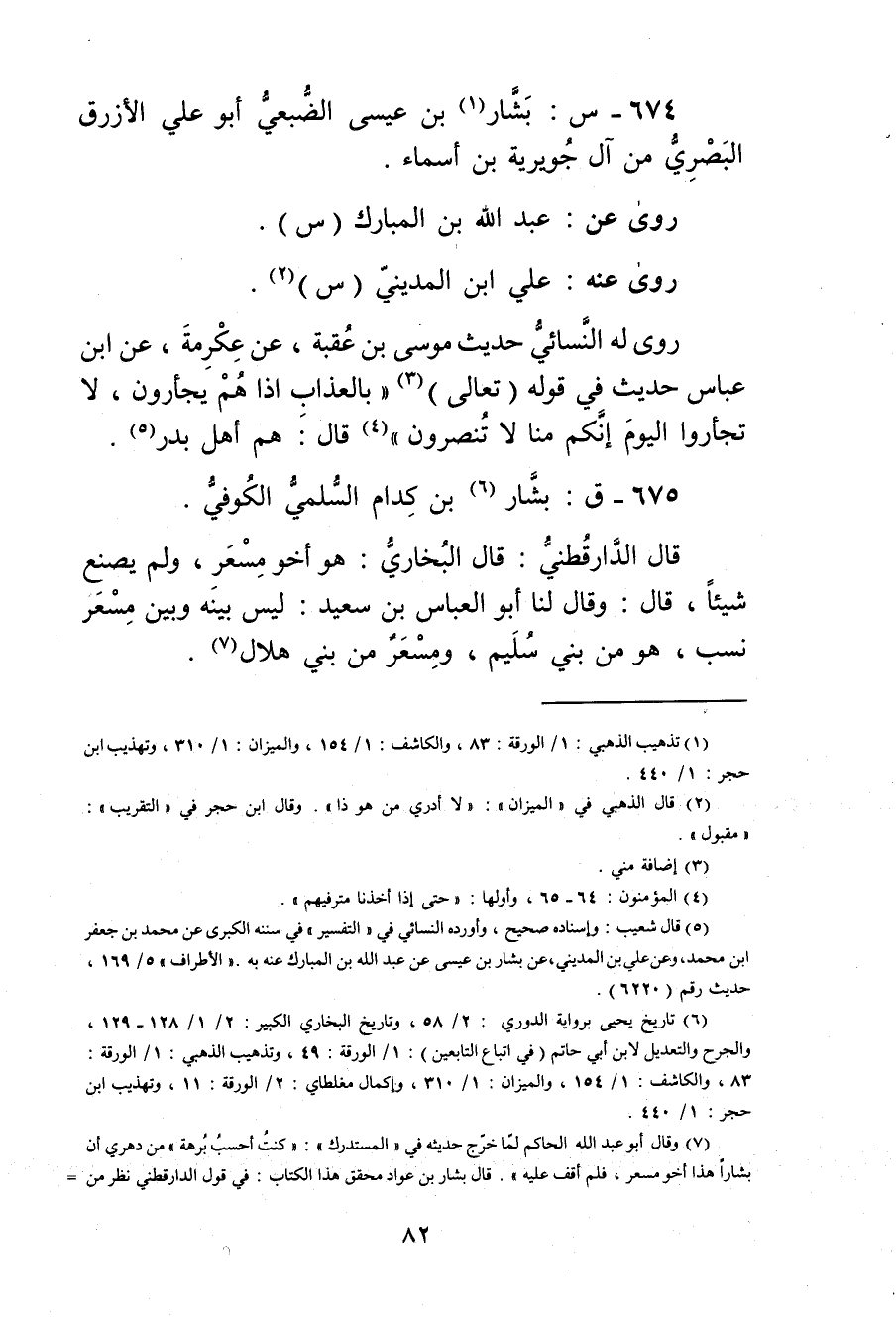 (7) وَقَال أبو عبد الله الحاكم لما خرج حديثه في "المستدرك": كنت أحسب برهة"من دهري أن بشارا هذا أخو مسعر، فلم أقف عليه"قال بشار بن عواد محقق هذا الكتاب: في قول الدَّارَقُطنِيّ نظر من =