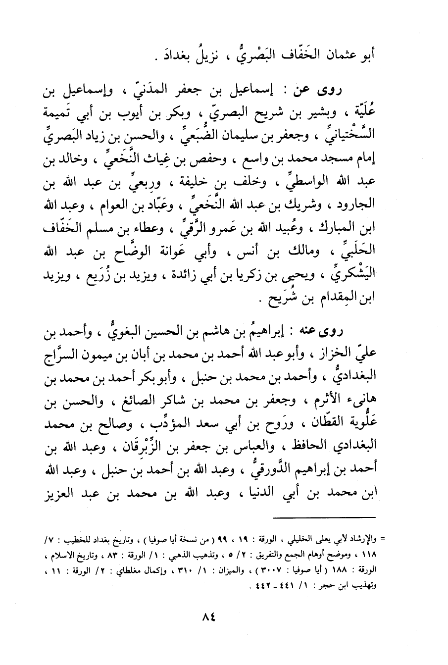 = والارشاد لابي يَعْلَى الخليلي، الورقة: 19، 99 (من نسخة أيا صوفيا) وتاريخ بغداد للخطيب: 7 / 118، وموضع أوهام الجمع والتفريق: 2 / 5، وتذهيب الذهبي: 1 / الورقة: 83، وتاريخ الاسلام، الورقة: 188 (أيا صوفيا: 3007) والميزان: 1 / 310، وإكمال مغلطاي: 2 / الورقة: 11، وتهذيب ابن حجر: 1 / 441 - 442.