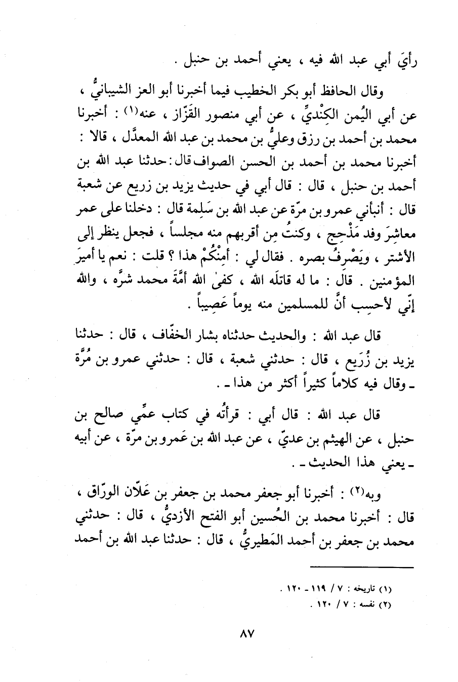 قال عَبْد اللَّهِ: قال أبي: قرأته فِي كتاب عمي صالح بْن حنبل، عَنِ الهيثم بْن عدي، عن عَبْد اللَّهِ بْن عَمْرو بْن مرة , عَن أبيه، يَعْنِي هذا الحديث - وبه (2) : أَخْبَرَنَا أَبُو جعفر مُحَمَّد بْن جعفر بْن علان الوراق. قال: أَخْبَرَنَا مُحَمَّد بْن الْحُسَيْن أَبُو الفتح الأزدي، قال: حَدَّثَنِي مُحَمَّد بْن جعفر بْن أحمد المطيري، قال: حَدَّثَنَا عَبْد اللَّهِ بن أحمد