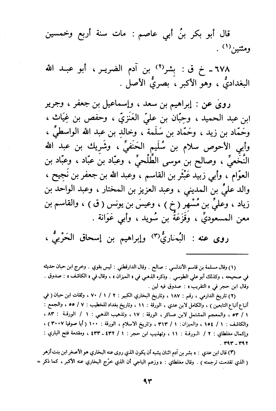 678 - خ ق: بشر بن آدم الضرير (2) ، أَبُو عَبْد اللَّهِ البغدادي، وهو الأكبر، بصري الأصل.