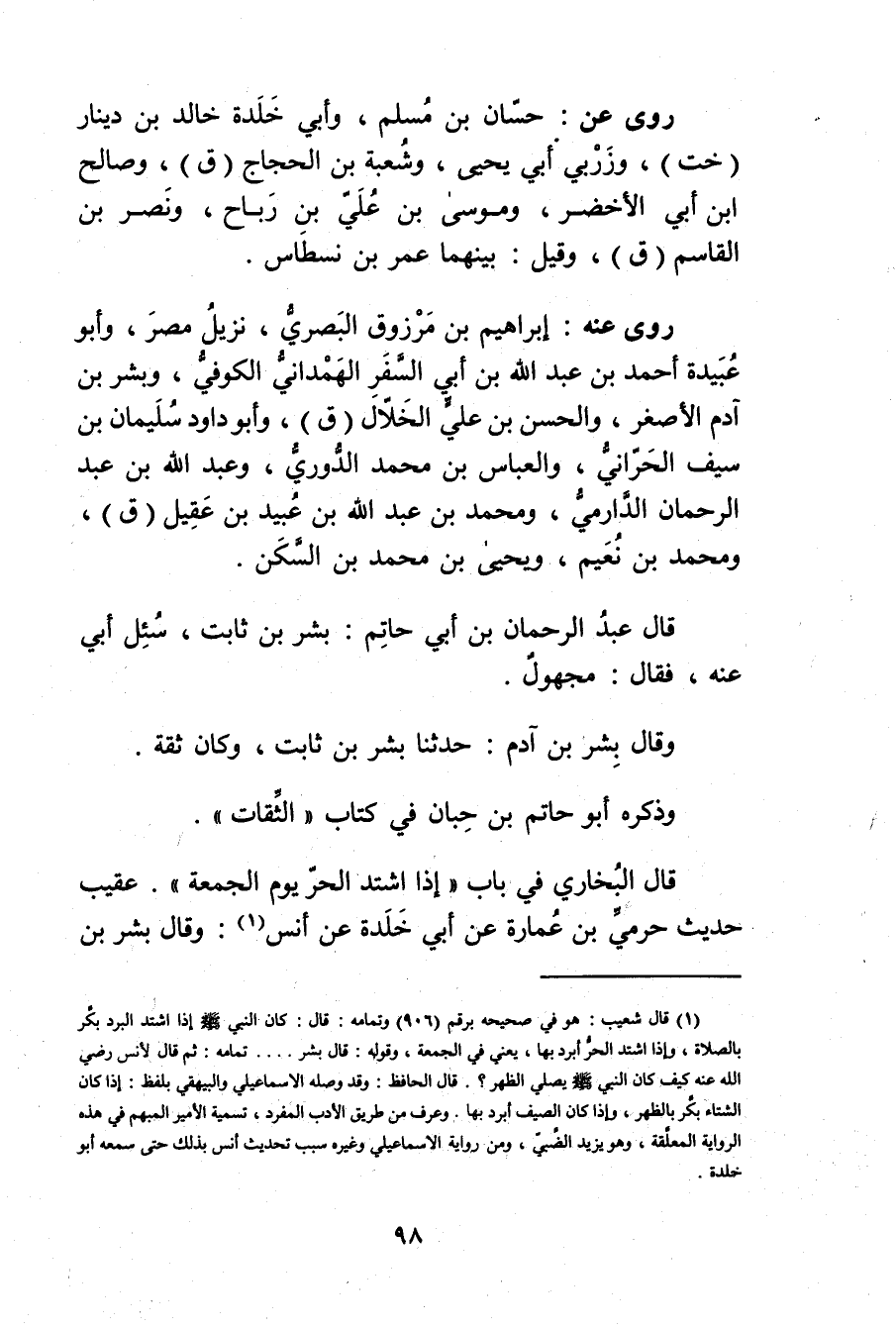 قال الْبُخَارِيّ فِي باب"إذا اشتد الحر يوم الجمعة". عقيب حديث حرمي بْن عمارة عَن أبي خلدة عَنْ أنس (1) : وَقَال بشر بْن