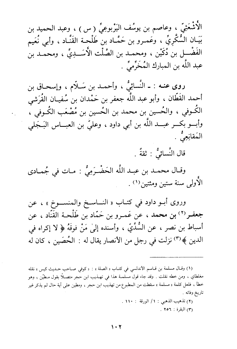 (1) وَقَال مسلمة بن قاسم الاندلسي في كتاب"الصلة": كوفي صاحب حديث كيس"نقله مغلطاي، ومن خطه نقلت. وقد جاء قول مسلمة هذا في تهذيب ابن حجر متصلا بقول مطين، وهو خطأ، فلعل كلمة"مسلمة"سقطت من المطبوع من تهذيب ابن حجر، ومطين على أية حال لم يذكر غير تاريخ وفاته.