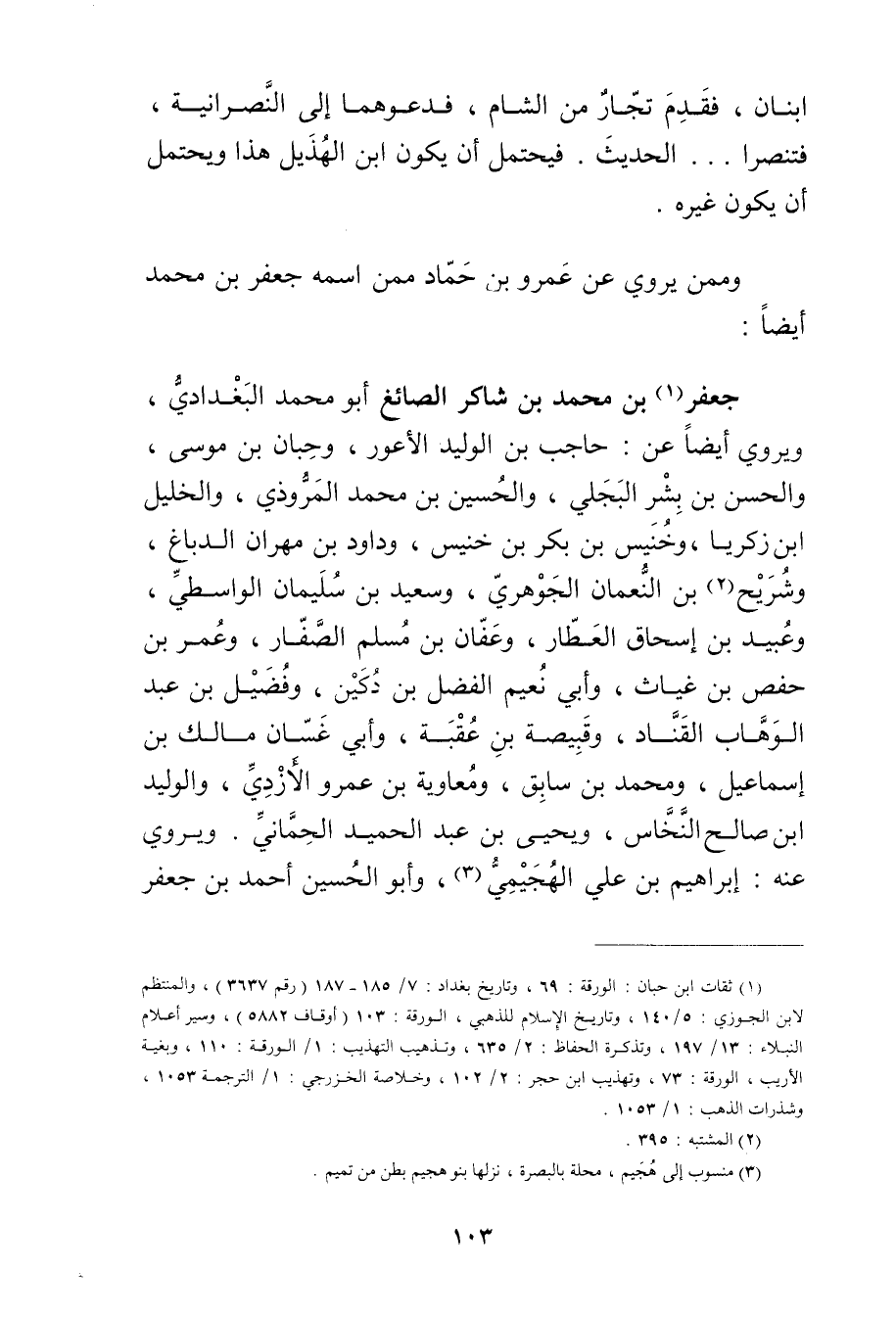 جعفر (1) بن مُحَمَّدِ بن شاكر الصائغ أَبُو محمد البغدادي، ويروي أيضاً عَن: حاجب بْن الوليد الأَعور، وحبان بْن مُوسَى، والحسن بْن بشر البجلي، والحسين بْن مُحَمَّد المروذي، والخليل ابن زكريا، وخنيس بْن بكر بْن خنيس، وداود بْن مهران الدباغ، وشريح (2) بْن النعمان الجوهري، وسَعِيد بْن سُلَيْمان الواسطي، وعُبَيد بْن إِسْحَاقَ العطار، وعفان بْن مسلم الصفار، وعُمَر بْن حفص بْن غياث، وأبي نعيم الفضل بْن دكين، وفضيل بْن عَبْدِ الوهاب القناد، وقبيصة بْن عقبة، وأبي غسان مالك بْن إِسْمَاعِيلَ، ومحمد بْن سابق، ومعاوية بْن عَمْرو الأزدي، والوليد ابن صالح النخاس، ويحيى بن عبد الحميد الحماني. ويروي عَنه: إبراهيم بْن عَلِيٍّ الهجيمي (3) ، وأَبُو الحسين أَحْمَد بن جعفر