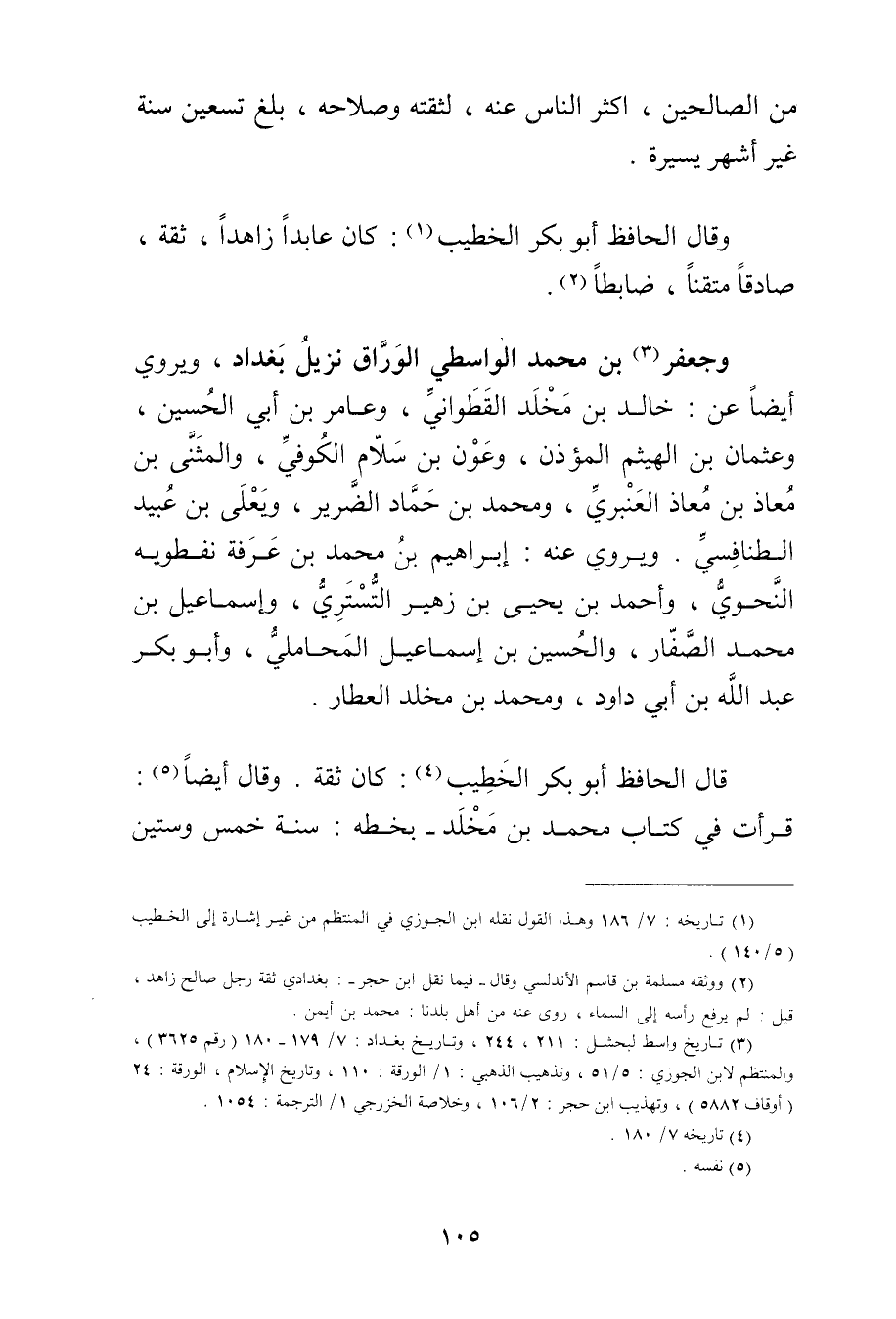 (1) تاريخه: 7 / 186 وهذا القول نقله ابن الجوزي في المنتظم من غير إشارة إلى الخطيب (5 / 140) .