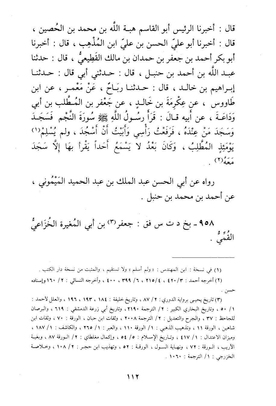 قال: أَخْبَرَنَا الرَّئِيسُ أَبُو الْقَاسِمِ هِبَةُ اللَّهِ بْن مُحَمَّد بْن الْحُصَيْن، قال: أَخْبَرَنَا أبو علي الحسن بن عَلِيِّ ابْنُ الْمُذْهِب، قال: أَخْبَرَنَا أَبُو بَكْرٍ أَحْمَدُ بْنُ جَعْفَرِ بْنِ حَمْدَانَ بْنِ مَالِكٍ القَطِيعِيّ، قال: حَدَّثَنَا عَبد اللَّهِ بْن أحمد بْن حنبل، قال: حَدَّثني أَبِي قال: حَدَّثَنَا إِبْرَاهِيمُ بْنُ خَالِدٍ، قال: حَدَّثَنَا رَبَاحُ، عَنْ معمر، عن ابن طاووس، عن عكرمة بْن خَالِد، عن جعفر بن المطلب بن أَبي ودَاعَةَ، عَن أَبِيهِ قال: قَرَأَ رَسُول اللَّهِ صلى الله عليه وسَلَّمَ سُورَةِ النَّجْمِ فَسَجَدَ وسَجَدَ مَنْ عِنْدَهُ، فَرَفَعْتُ رَأْسِي وأَبَيْتُ أَنْ أَسْجُدَ، ولَمْ يُسْلِمْ (1) يَوْمَئِذٍ الْمُطَّلِبُ، وكَانَ بَعْدُ لا يَسْمَعُ أَحَدًا يَقْرَأُ بِهَا إِلا سَجَدَ مَعَهُ (2) .