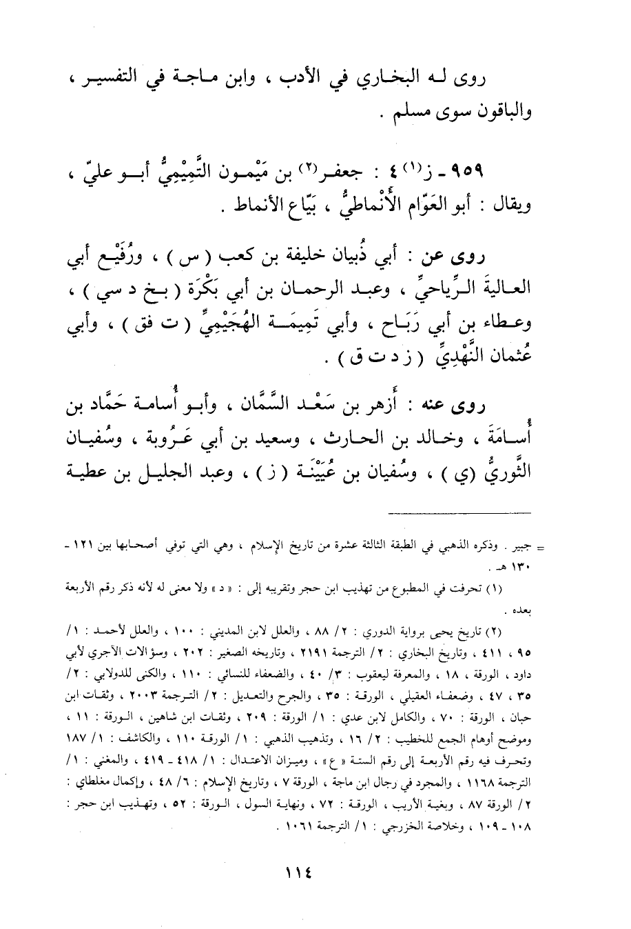 959 ز (1) 4: جعفر بن ميمون التميمي أَبُو علي (2) ، ويُقال: أَبُو العوام الأنماطي، بياع الأنماط.
