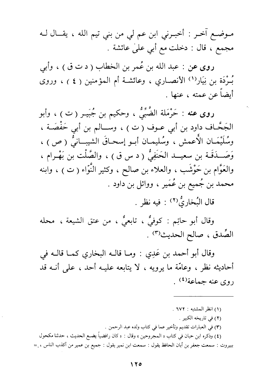 موضع آخر: أَخْبَرَنِي ابن عم لي من بني تيم اللَّه، يقال له مجمع، قال: دخلت مع أبي على عائشة.