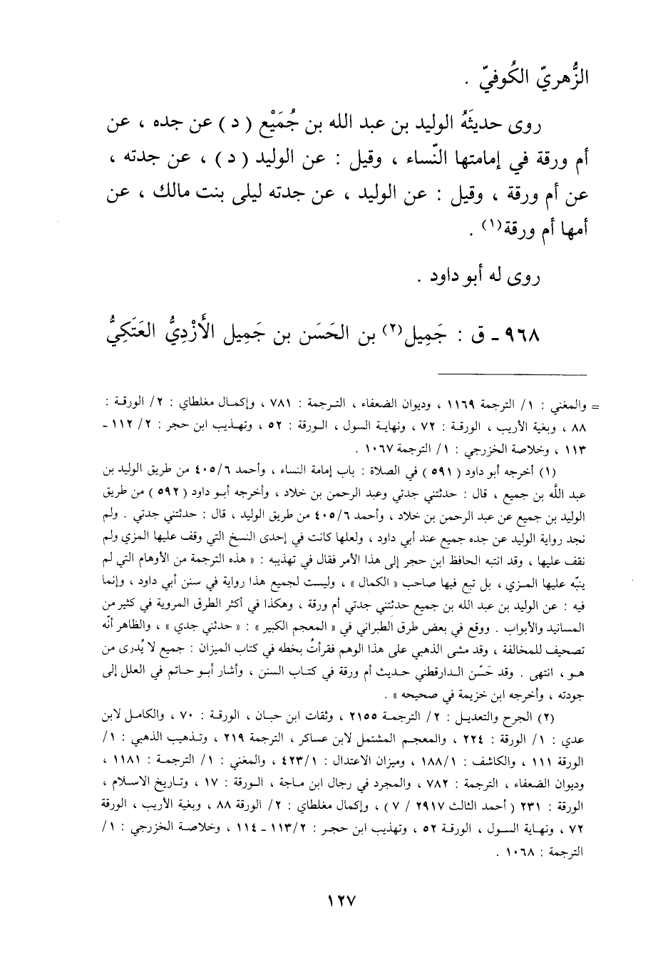 (1) أخرجه أبو داود (591) في الصلاة: باب إمامة النساء، وأحمد 6 / 405 من طريق الوليد بن عَبد الله بن جميع، قال: حدثتني جدتي وعبد الرحمن بن خلاد، وأخرجه أبو داود (592) من طريق الوليد بن جميع عن عَبد الرحمن بن خلاد، وأحمد 6 / 405 من طريق الوليد، قال: حدثتني جدتي. ولم نجد رواية الوليد عن جده جميع عند أبي داود، ولعلها كانت في إحدى النسخ التي وقف عليها المزي ولم نقف عليها، وقد انتبه الحافظ ابن حجر إلى هذا الامر فقال في تهذيبه: هذه الترجمة من الأَوهام التي لم ينبه عليها المزي، بل تبع فيها صاحب "الكمال"، وليست لجميع هذا رواية في سنن أبي داود، وإنما فيه: عن الوليد بن عَبد الله بن جميع حدثتني جدتي أم ورقة وهكذا في أكثر الطرق المروية في كثير من المسانييد والابواب.