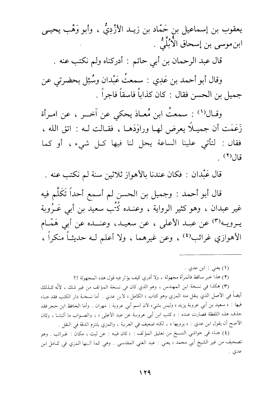 قال أَبُو أَحْمَدَ: وجميل بْن الحسن لم أسمع أحدا تكلم فيه غير عبدان، وهو كثير الرواية، وعنده كتب سَعِيد بْن أَبي عَرُوبَة يرويه (3) عن عبد الاعلى، عن سَعِيد، وعنده عَن أَبِي همام الأهوازي غرائب (4) ، وعن غيرهما، ولا أعلم لَهُ حديثا منكرا،
