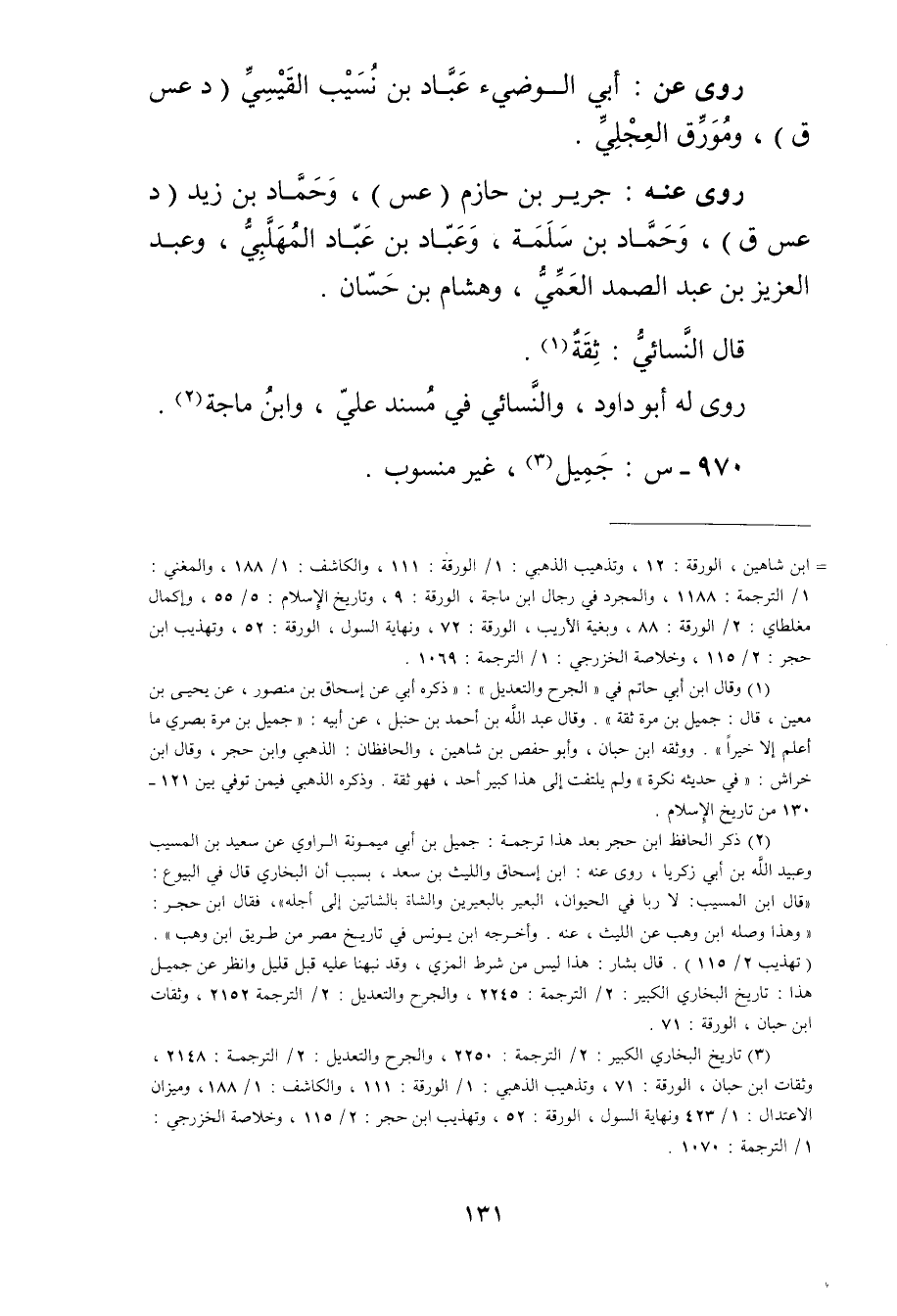 (3) تاريخ البخاري الكبير: 2 / الترجمة: 2250، والجرح والتعديل: 2 / الترجمة: 2148، وثقات ابن حبان، الورقة: 71، وتذهيب الذهبي: 1 / الورقة: 111، والكاشف: 1 / 188، وميزان الاعتدال: 1 / 423 ونهاية السول، الورقة: 52، وتهذيب ابن حجر: 2 / 115، وخلاصة الخزرجي: 1 / الترجمة: 1070.