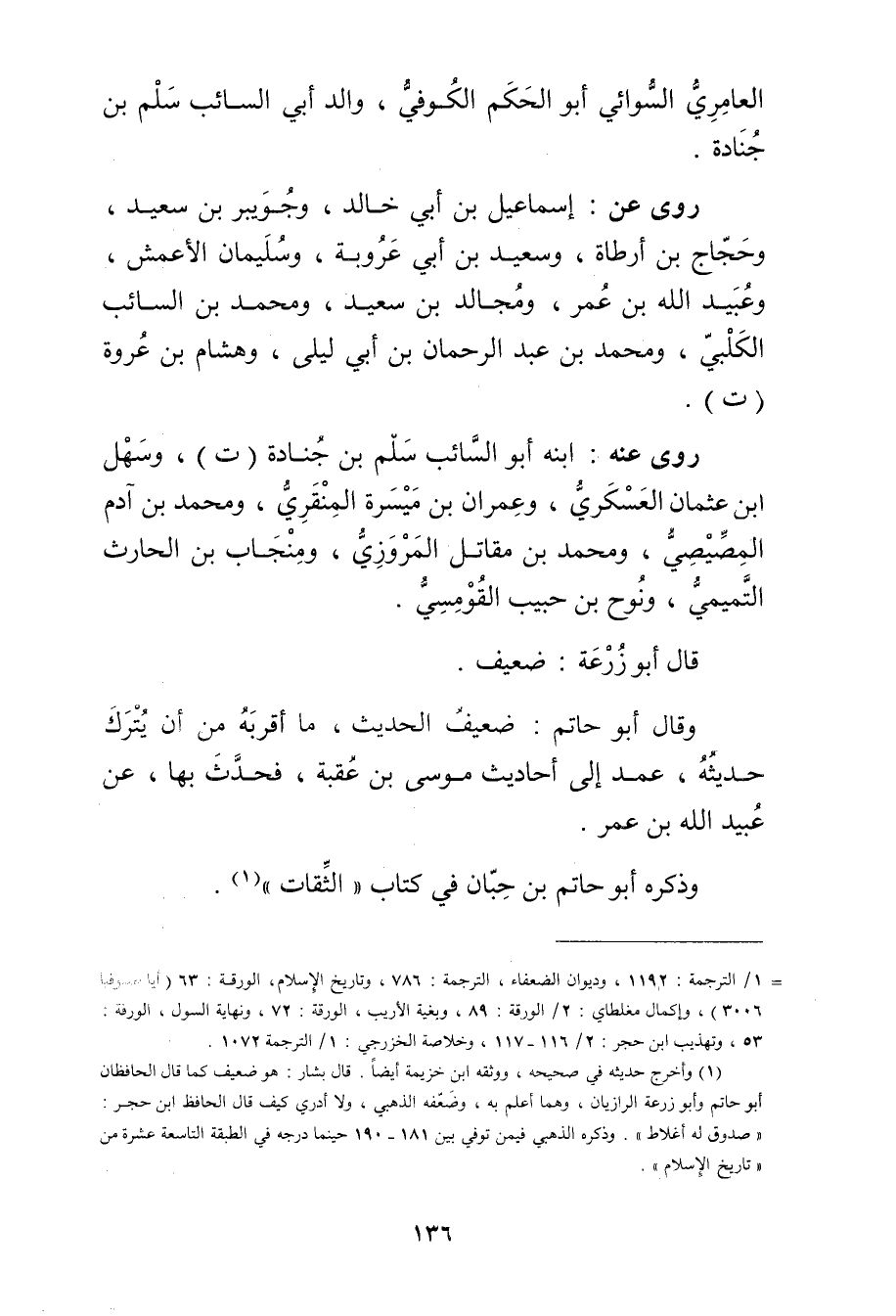 = 1 / الترجمة: 1192، وديوان الضعفاء، الترجمة: 786، وتاريخ الاسلام، الورقة: 63 (أيا صوفيا 3006) ، وإكمال مغلطاي: 2 / الورقة: 89، وبغية الاريب، الورقة: 72، ونهاية السول، الورقة: 53، وتهذيب ابن حجر: 2 / 117 1116، وخلاصة الخزرجي: 1 / الترجمة 1072.