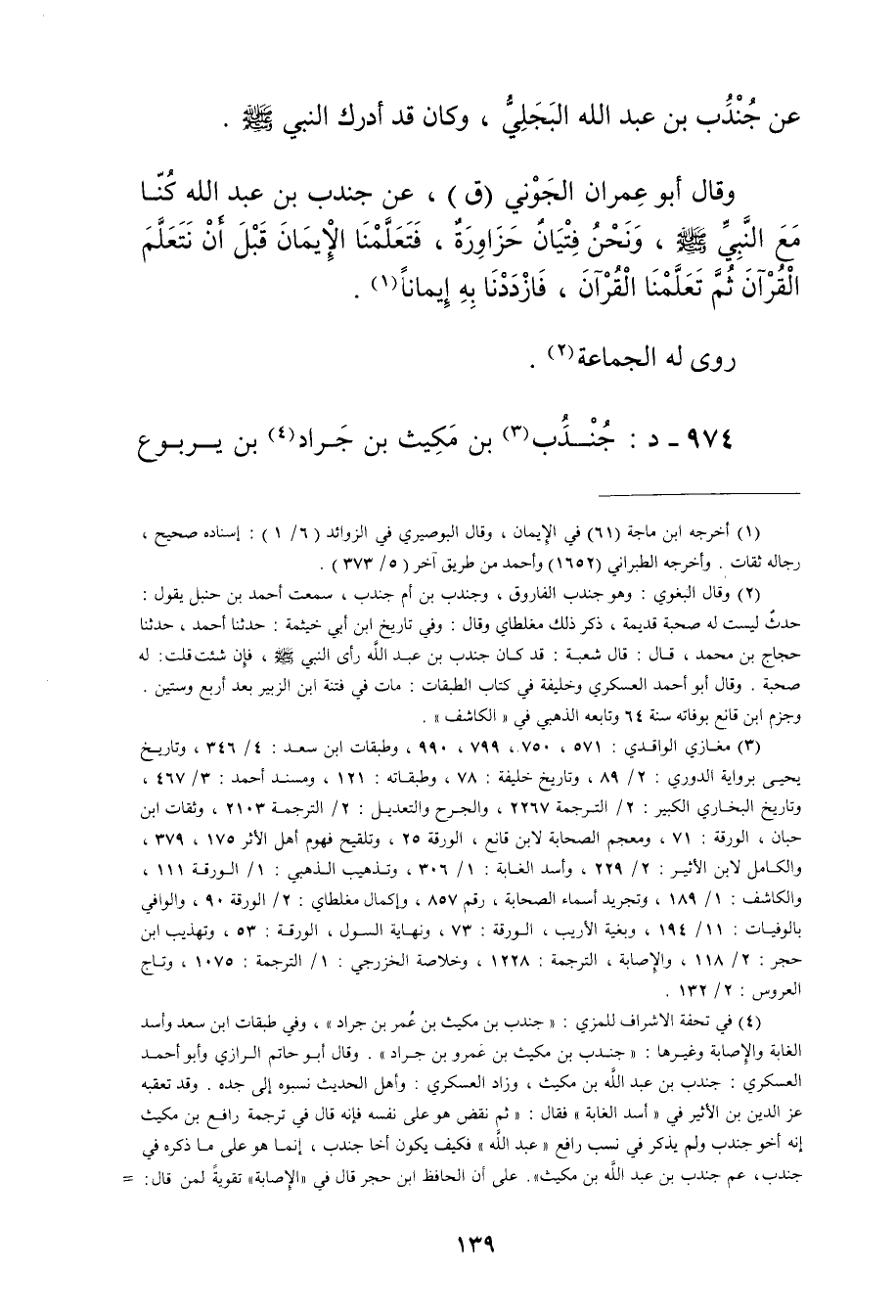 (4) في تحفة الاشراف للمزي: جندب بن مكيث بن عُمَر بن جراد"، وفي طبقات ابن سعد وأسد الغابة والاصابة وغيرها: جندب بن مكيث بن عَمْرو بن جراد". وَقَال أبو حاتم الرازي وأبو أحمد العسكري: جندب بن عَبد الله بن مكيث، وزاد العسكري: وأهل الحديث نسبوه إلى جده.