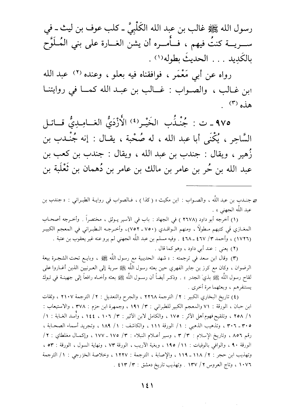 975 ت: جندب الخير الأزدي الغامدي قاتل الساحر (4) ، يكنى أبا عَبد اللَّهِ، لهُ صُحبَةٌ، يقال: إنه جندب بْن زهير، ويُقال: جندب بْن عَبد اللَّهِ، ويُقال: جندب بْن كعب بْن عَبد اللَّهِ بْنِ حر بْن عامر بْن مالك بْن عامر بْن دهمان بن ثعلبة بْن
