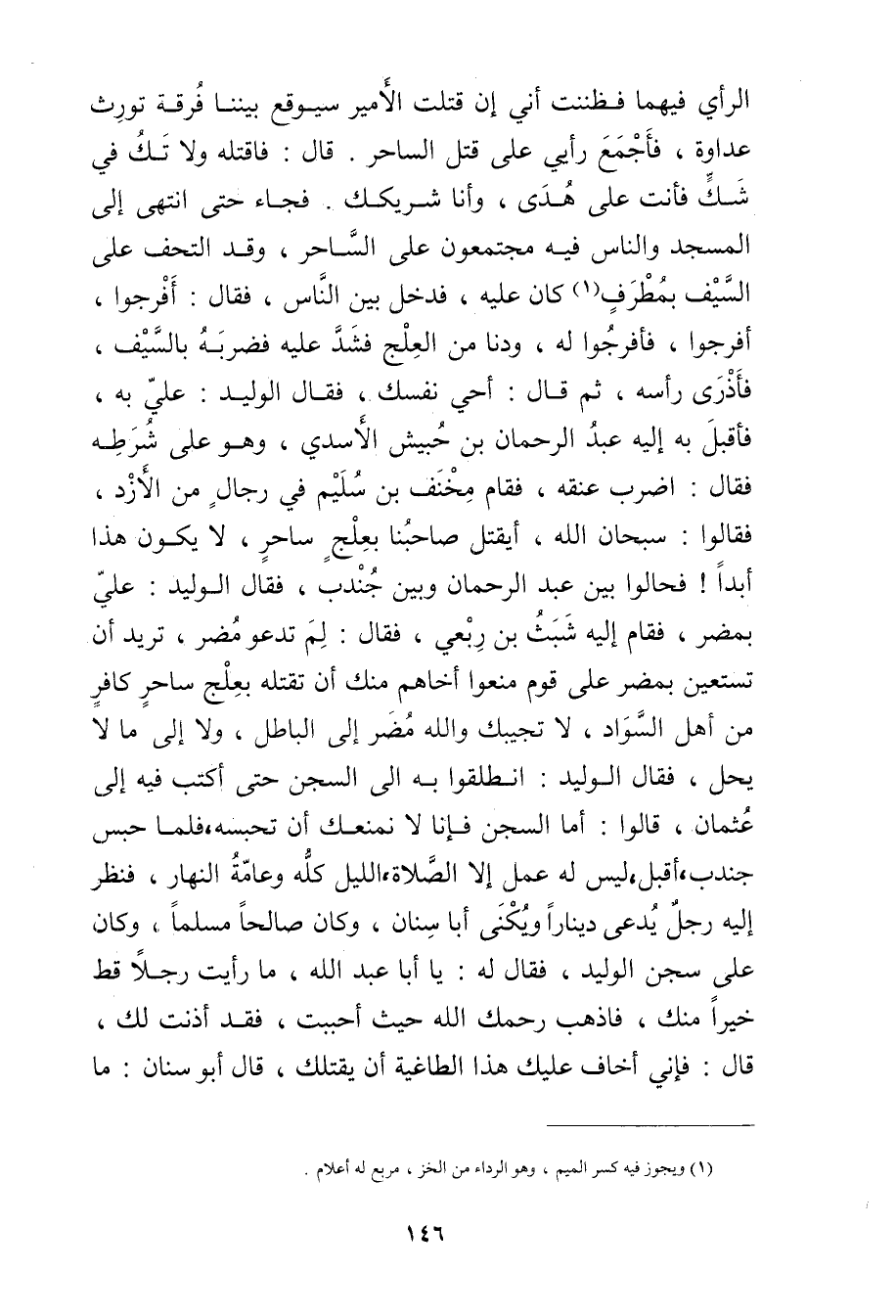 الرَّأْيَ فِيهِمَا فَظَنَنْتُ أَنِّي إِنْ قَتَلْتُ الأَمِيرَ سَيُوقِعُ بَيْنَنَا فُرْقَةً تُورِثُ عَدَاوَةً، فَأَجْمَعَ رَأْيِي عَلَى قَتْلِ السَّاحِرِ. قال: فَاقْتُلْهُ ولا تَكُ فِي شَكٍّ فَأَنْتَ عَلَى هُدًى، وأَنَا شَرِيكك. فَجَاءَ حَتَّى انْتَهَى إِلَى الْمَسْجِدِ والنَّاسُ فِيهِ مُجْتَمِعُونَ عَلَى السَّاحِرِ، وقَدِ الْتَحَفَ عَلَى السَّيْفِ بِمُطْرَفٍ (1) كَانَ عَلَيْهِ، فدخل بين الناس، فقال: أفرحوا، أَفْرِجُوا، فَأَفْرَجُوا لَهُ، ودَنَا مِنَ الْعِلْجِ فَشَدَّ عَلَيْهِ فَضَرَبَهُ بِالسَّيْفِ، فَأَذْرَى رَأْسَهُ، ثُمَّ قال: أَحْيِ نَفْسَكَ، فَقَالَ الْوَلِيدُ: عَلَيَّ بِهِ، فَأَقْبَلَ بِهِ إِلَيْهِ عَبْدُ الرَّحْمَنِ بْنُ حُبَيْشٍ الأَسَدِيُّ، وهُوَ عَلَى شُرَطِهِ فَقَالَ: اضْرِبْ عُنُقَهُ، فَقَامَ مِخْنَفُ بْنُ سُلَيْمٍ فِي رِجَالٍ مِنَ الأَزْدِ، فَقَالُوا: سُبْحَانَ اللَّه، أَيُقْتَلُ صَاحِبُنَا بِعِلْجٍ سَاحِرٍ، لا يَكُونُ هَذَا أَبَدًا! فَحَالُوا بَيْنَ عَبْدِ الرَّحْمَنِ وبَيْنِ جُنْدُبٍ، فَقَالَ الْوَلِيدُ: عَلَيَّ بِمُضَرَ، فَقَامَ إِلَيْهِ شَبَثُ بْنُ رِبْعِيٍّ، فَقَالَ: لِمَ تَدْعُو مُضَرَ، تُرِيدُ أَنْ تَسْتَعِينَ بِمُضَرَ عَلَى قَوْمٍ مَنَعُوا أَخَاهُمْ مِنْكَ أَنْ تَقْتُلَهُ بِعِلْجٍ سَاحِرٍ كَافِرٍ مِنْ أَهْلِ السَّوَادِ، لا تُجِيبُكَ واللَّهِ مُضَرُ إِلَى الْبَاطِلِ، ولا إِلَى مَا لا يَحِلُّ، فَقَالَ الْوَلِيدُ: انْطَلِقُوا بِهِ إِلَى السِّجْنِ حَتَّى أَكْتُبَ فِيهِ إِلَى عُثْمَانَ، قَالُوا: أَمَّا السِّجْنُ فَإِنَّا لا نَمْنَعُكَ أَنْ تَحْبِسَهُ، فَلَمَّا حُبِسَ جُنْدُبٌ، أَقْبَلَ، لَيْسَ لَهُ عَمَلٌ إِلا الصَّلاةَ، اللَّيْلَ كُلَّهُ وعَامَّةَ النَّهَارِ، فَنَظَر إِلَيْهِ رَجُلٌ يُدْعَى دِينَارًا ويُكْنَى أَبَا سِنَانٍ، وكَانَ صَالِحًا مُسْلِمًا، وكَانَ عَلَى سِجْنِ الْوَلِيدِ، فَقَالَ لَهُ: يَا أَبَا عَبد اللَّهِ، مَا رَأَيْتُ رَجُلا قَطُّ خَيْرًا مِنْكَ، فَاذْهَبْ رَحِمَكُ اللَّه حَيْثُ أَحْبَبْتَ، فَقَدْ أَذِنْتُ لَكَ، قال: فَإِنِّي أَخَافُ عَلَيْكَ هَذَا الطَّاغِيَةَ أَنْ يَقْتُلَكَ، قال أبو سنان: ما