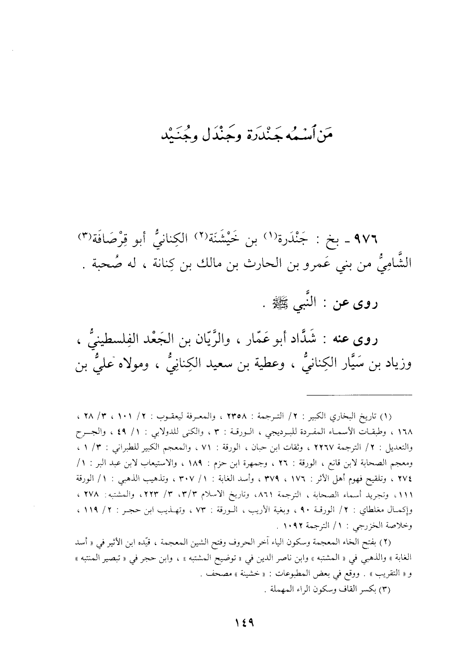 976 بخ: جندرة (1) بن خيشنة (2) الكناني أَبُو قرصافة (3) الشامي من بني عَمْرو بْن الحارث بْن مالك بْن كنانة، له صحبة.