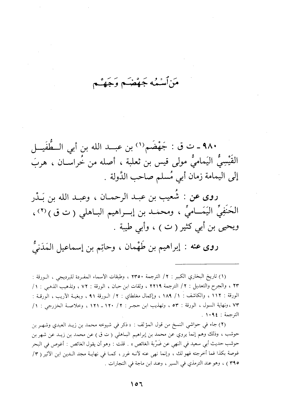 980 ت ق: جهضم بن عَبد اللَّهِ بن أَبي الطفيل (1) القيسي اليمامي مولى قيس بْن ثعلبة، أصله من خراسان، هرب إلى اليمامة زمان أبي مسلم صاحب الدولة.