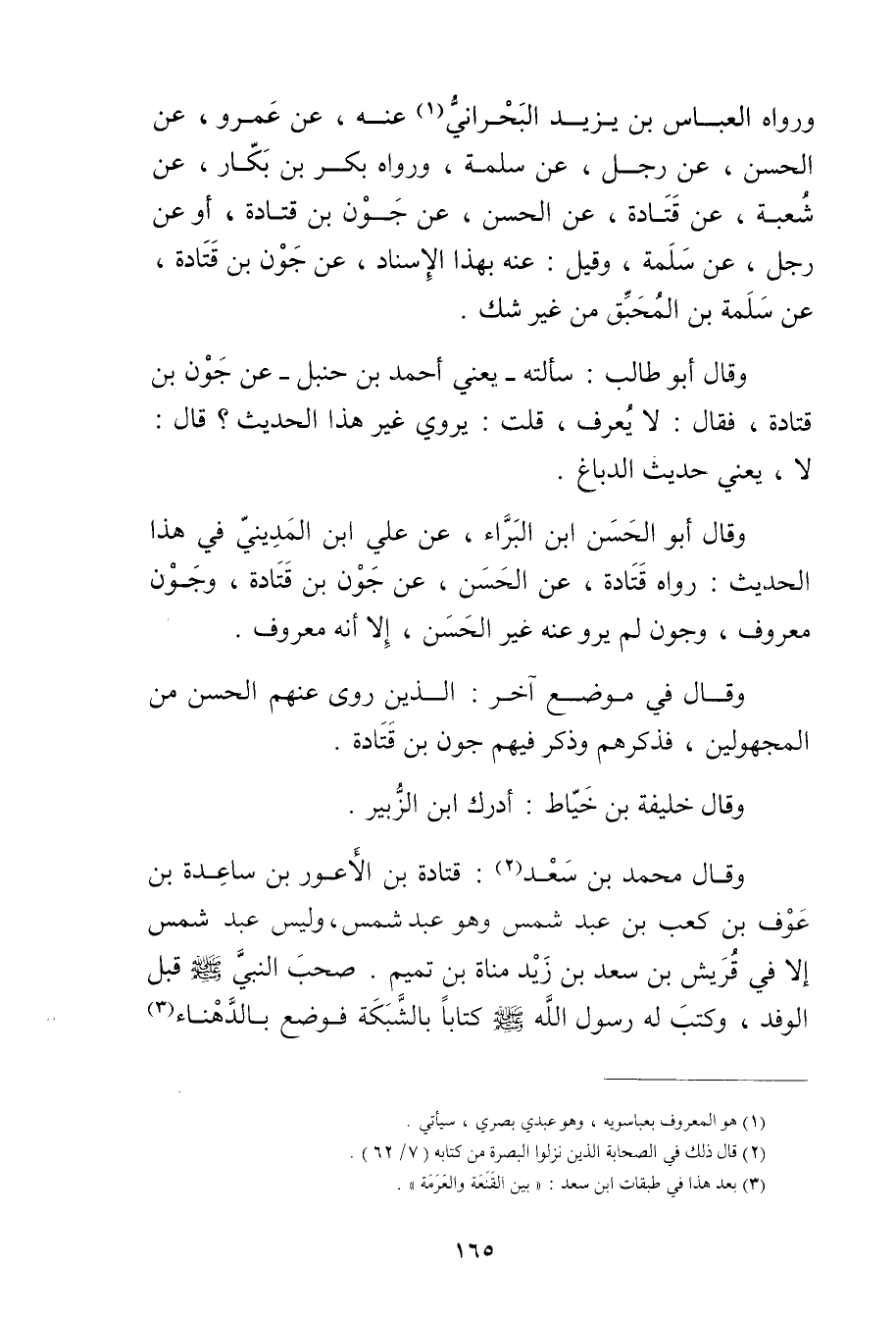 وَقَال مُحَمَّد بْن سعد (2) : قتادة بن الأَعور بن ساعدة بن عوف بن كعب بن عَبْد شمس وهو عَبْد شمس، وليس عَبْد شمس إلا في قريش بْن سعد بْن زيد مناة بْن تميم. صحب النبي صَلَّى اللَّهُ عليه وسلم قبل الوفد، وكتب له رَسُول اللَّهِ صَلَّى اللَّهُ عليه وسلم كتابا بالشبكة فوضع بالدهناء (3)