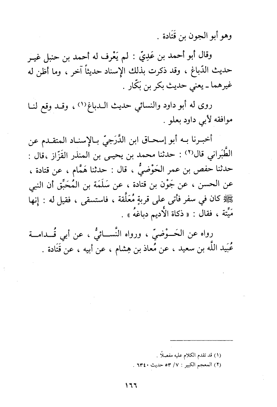 أَخْبَرَنَا بِهِ أبو إسحاق ابن الدَّرَجِيِّ بِالإِسْنَادِ الْمُتَقَدِّمِ عَنِ الطَّبَرَانِيِّ قال (2) : حَدَّثَنَا مُحَمَّد بْن يَحْيَى بْنِ الْمُنْذِرِ الْقَزَّازُ، قال: حَدَّثَنَا حَفْصُ بْنُ عُمَر الْحَوْضِيُّ، قال: حَدَّثَنَاهمام، عَنْ قَتَادَةَ، عَنِ الْحَسَنِ، عَنْ جَوْنِ بْنِ قَتَادَةَ، عَنْ سَلَمَةَ بْنِ الْمُحَبِّق أَنَّ النَّبِيَّ صَلَّى اللَّهُ عَلَيْه وسَلَّمَ كَانَ فِي سَفَرٍ فَأَتَى عَلَى قِرْبَةٍ مُعَلَّقَةٍ، فَاسْتَسْقَى، فَقِيلَ لَهُ: إِنَّهَا مَيْتَةٌ، فَقَالَ: ذَكَاةُ الأَدِيمِ دِبَاغُهُ.