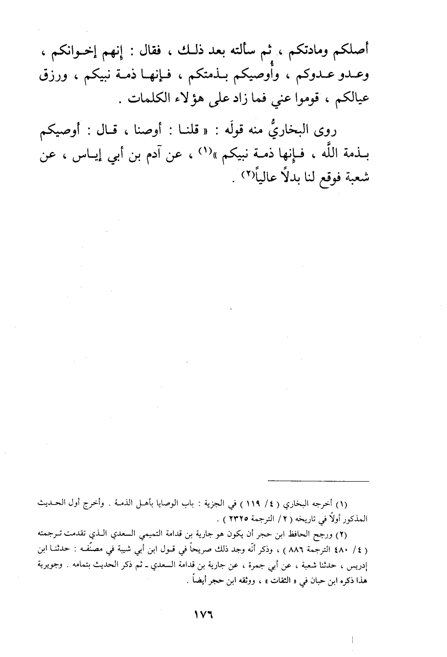 رَوَى الْبُخَارِيُّ مِنْهُ قَوْلَهُ: قُلْنَا: أَوْصِنَا، قال: أُوصِيكُمْ بِذِمَّةِ اللَّه، فَإِنَّهَا ذِمَّةُ نَبِيِّكُمْ" (1) ، عَنْ آدَمَ بْنِ أَبي إِيَاسٍ، عَنْ شُعْبَةَ فوقع لنا بدلا عاليا (2) .