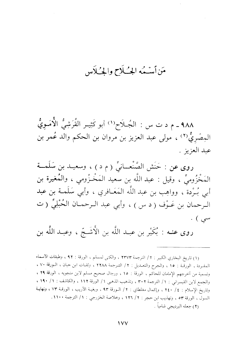 988 م د ت س: الجلاح أَبُو كثير (1) القرشي الأُمَوِي المِصْرِي (2) ، مولى عَبْد الْعَزِيزِ بْن مروان بْن الحكم والد عُمَر بْن عبد العزيز.