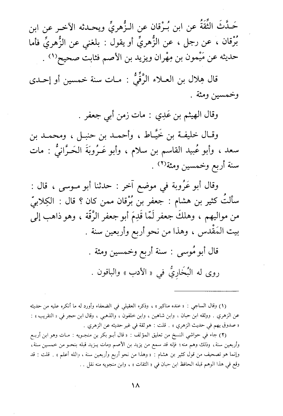 وَقَال أَبُو عَرُوبَة في موضع آخر: حَدَّثَنَا أَبُو مُوسَى، قال: سألت كثير بْن هشام: جعفر بْن برقان ممن كَانَ؟ قال: الكِلابي من مواليهم، وهلك جعفر لما قدم أَبُو جَعْفَرٍ الرقة، وهو ذاهب إلي بيت المقدس، وهذا من نحو أربع وأربعين سنة.
