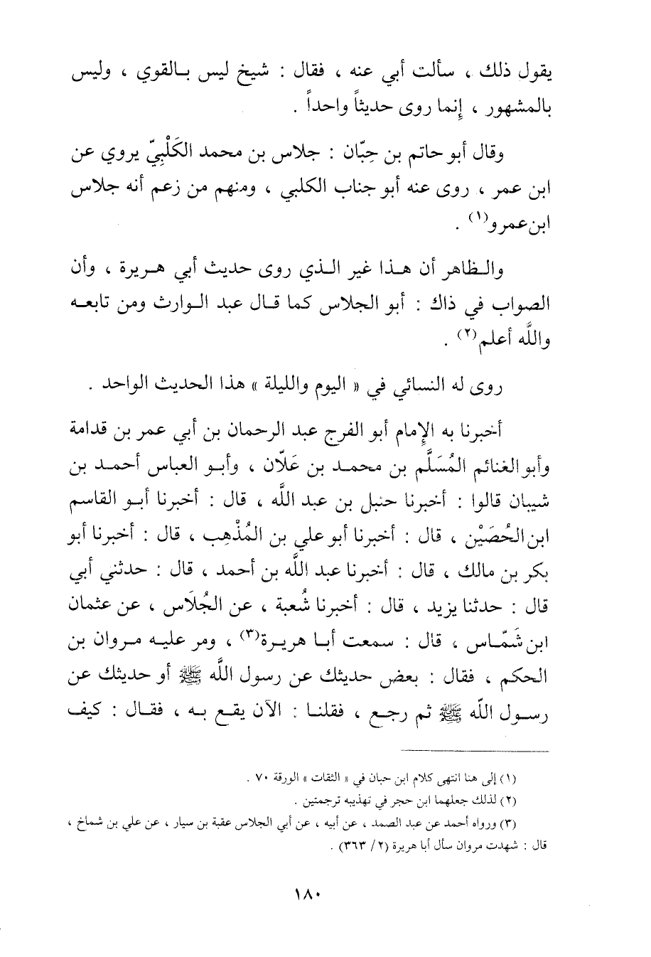 أَخْبَرَنَا بِهِ الإِمَامُ أَبُو الْفَرَجِ عَبْدُ الرَّحْمَنِ بْنُ أَبي عُمَر بْن قدامة وأبو الْغَنَائِمِ الْمُسْلِمُ بْنُ مُحَمَّدِ بْنِ عَلانَ، وأَبُو الْعَبَّاسِ أَحْمَدُ بْنُ شَيْبَانَ قَالُوا: أَخْبَرَنَا حَنْبَلُ بْنُ عَبد اللَّهِ، قال: أخبرنا أَبُو القاسم ابن الحصين، قال: أخبرنا أَبُو علي بْن المذهب، قال: أَخْبَرَنَا أبو بكر بْن مالك، قال: أَخْبَرَنَا عَبد اللَّهِ بْنُ أَحْمَدَ، قال: حَدَّثني أبي قال: حَدَّثَنَا يَزِيدُ، قال: أَخْبَرَنَا شُعْبَةُ، عَنِ الجلاس، عن عثمان ابن شَمَّاسٍ، قال: سَمِعْتُ أَبَا هُرَيْرة (3) ، ومر عليه مروان ببن الْحَكَمِ، فَقَالَ: بَعْضُ حَدِيثِكَ عَنْ رَسُول اللَّهِ صلى الله عليه وسَلَّمَ أَوْ حَدِيثُكَ عَنْ رَسُولِ اللَّهِ صلى الله عليه وسلم ثُمَّ رَجَعَ، فَقُلْنَا: الآنَ يَقَعُ به، فقال: كيف