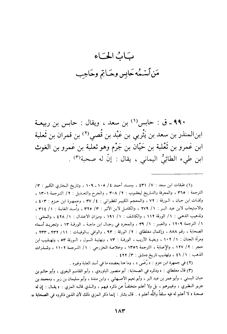 990 ق: حابس بن سعد (1) ، ويُقال: حابس بْن ربيعة ابن المنذر بْن سعد بْن يثربي بْن عَبْد بْن قصي (2) بْن قمران بن ثعلبة ابن عَمْرو بْن ثعلبة بْن حيان بْن جرم وهو ثعلبة بْن عَمْرو بن الغوث ابن طئ الطائي اليماني، يقال: إنه لهُ صُحبَةٌ (3) .