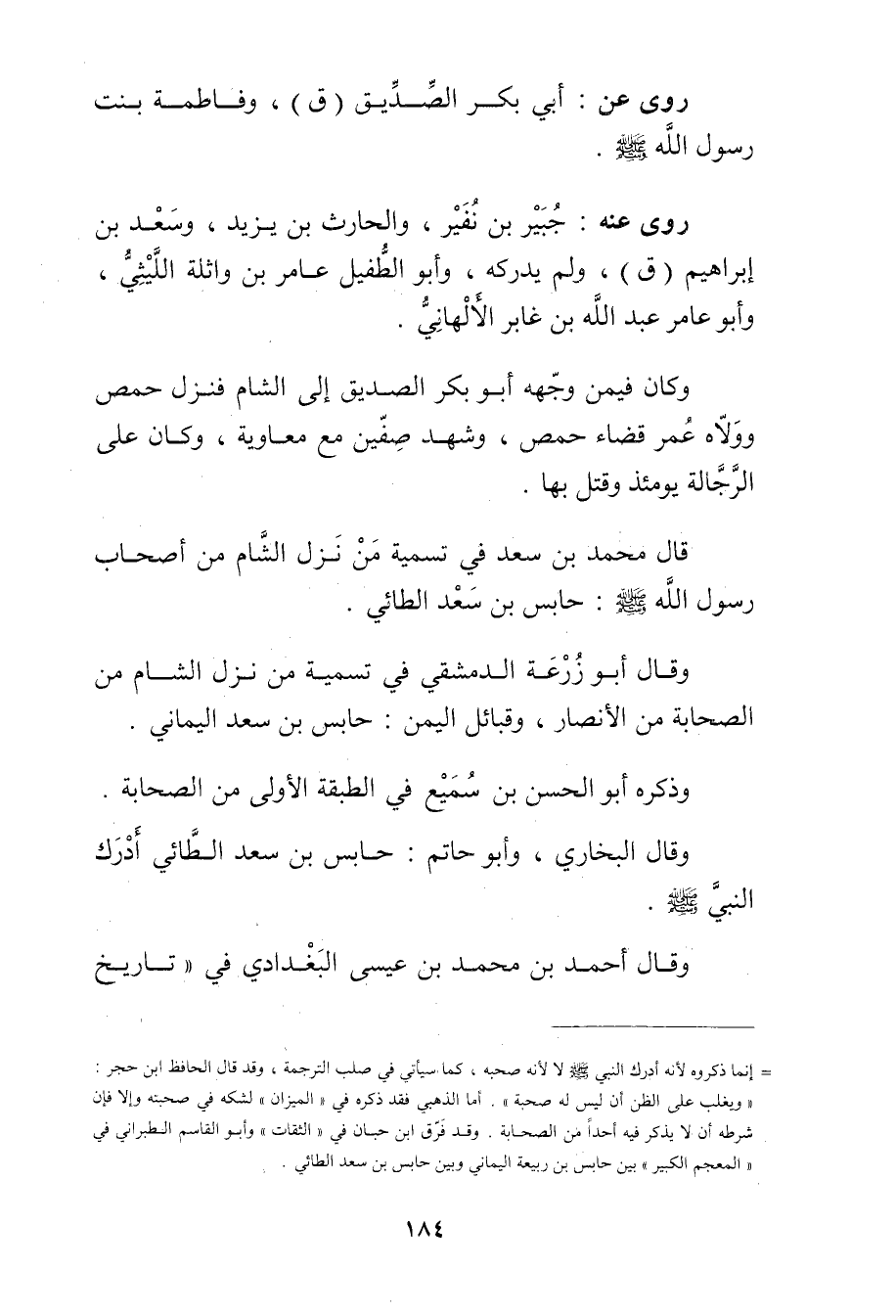 = إنما ذكروه لانه أدرك النَّبِيّ صَلَّى اللَّهُ عَلَيْهِ وسلم لا لانه صحبه، كما سيأتي في صلب الترجمة، وقد قال الحافظ ابن حجر: ويغلب على الظن أن ليس له صحبة". أما الذهبي فقد ذكره في "الميزان"لشكه في صحبته وإلا فإن شرطه أن لا يذكر فيه أحدًا من الصحابة. وقد فرق ابن حبان في "الثقات" وأبو الْقَاسِم الطبراني في "المعجم الكبير"بين حابس بن ربيعة اليماني وبين حابس بن سعد الطائي.