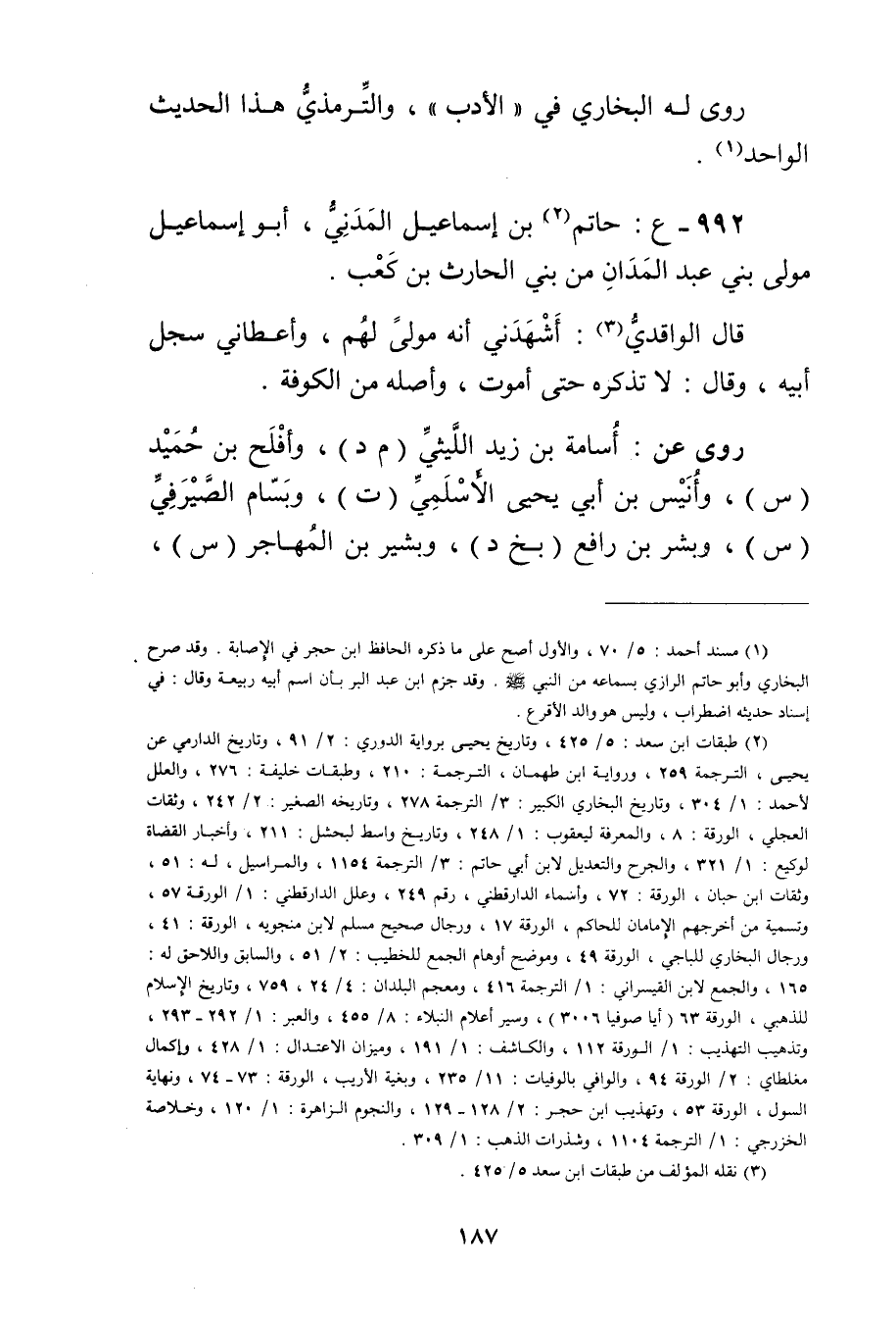 992 ع: حاتم بن إِسْمَاعِيلَ المدني (2) ، أَبُو إسماعيل مولى بني عبد المدان من بني الحارث بْن كعب.