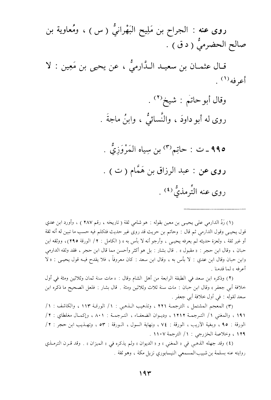 (1) رد الدارمي على يحيى بن مَعِين بقوله: هو شامي ثقة (تاريخه، رقم 287) وأورد ابن عدي قول يحيى وقول الدارمي ثم قال: وحاتم بن حريث قد روى غير حديث فتكلم فيه حسب ما تبين له أنه ثقة أو غير ثقة، ولعزة حديثه لم يعرفه يحيى، وأرجو أنه لا بأس به" (الكامل: 2 / الورقة 295) ، ووثقه ابن حبان، وَقَال ابن حجر: مقبول". قال بشار: بل هو أكثر وأحسن مما قال ابن حجر، فقد وثقه الدارمي وابن حبان وَقَال ابن عدي: لا بأس به، وَقَال ابن سعد: كان معروفا، فلا يقدح فيه قول يحيى: لا أعرفه"لما قدمنا.