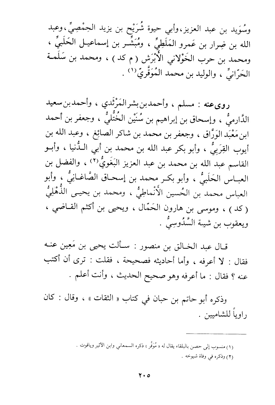 وذكره أَبُو حاتم بْن حبان في كاتب "الثقات"، وَقَال: كان راوياً للشاميين.