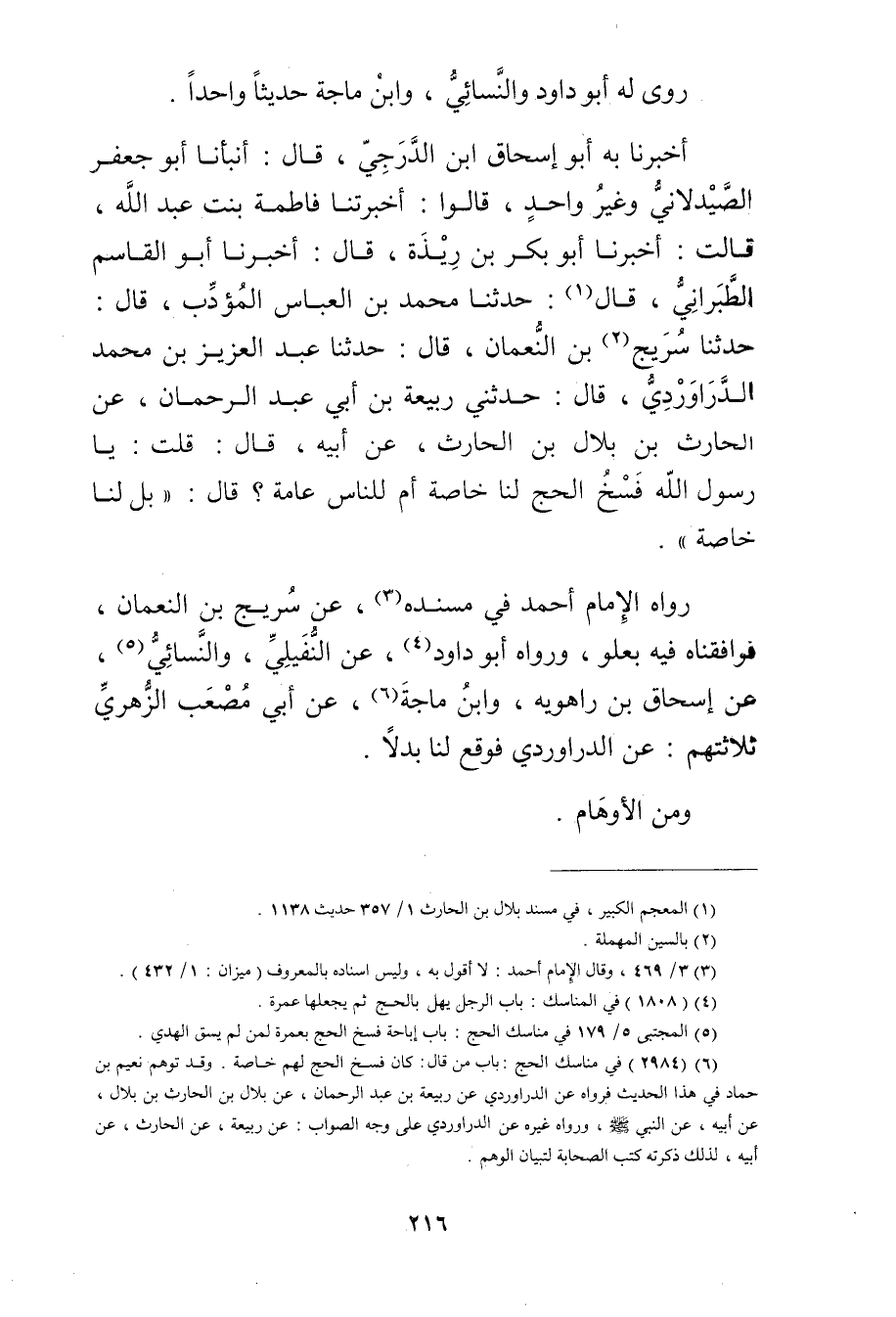 (6) (2984) في مناسك الحج: باب من قال: كان فسخ الحج لهم خاصة. وقد توهم نعيم بْن حماد في هذا الحديث فرواه عن الدَّراوَرْدِيّ عن ربيعة بن عبد الرحمن، عن بلال بن الحارث بن بلال، عَن أَبِيهِ، عَنِ النَّبِيِّ صلى الله عليه وسلم، ورواه غيره عن الدَّراوَرْدِيّ على وجه الصواب: عن ربيعة، عن الحارث، عَن أبيه، لذلك ذكرته كتب الصحابة لتبيان الوهم.