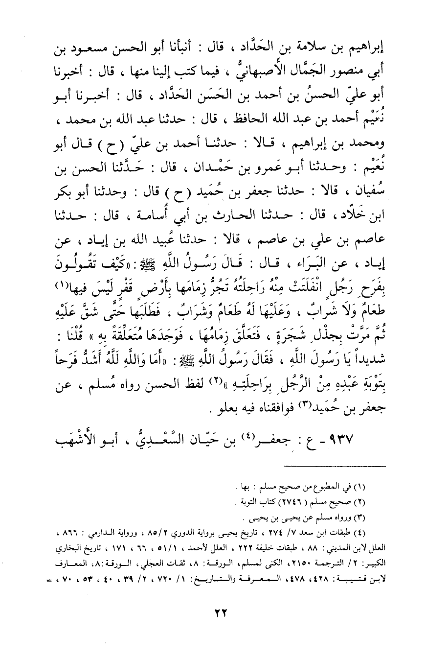 إِبْرَاهِيم بْن سلامة بْن الحداد، قال: أَنْبَأَنَا أَبُو الْحَسَنِ مَسْعُودُ بن أَبي منصور الجمالل الأَصْبَهَانِيُّ، فِيمَا كَتَبَ إِلَيْنَا مِنْهَا، قال: أَخْبَرَنَا أبو علي الحسن بْن أَحْمَد بْن الْحَسَن الحداد، قال: أَخْبَرَنَا أبو نعيم أحمد بْن عَبد الله الحافظ، قال: حَدَّثَنَا عَبد اللَّهِ بْن مُحَمَّد، ومحمد بْن إِبْرَاهِيم، قالا: حَدَّثَنَا أَحْمَدُ بْنُ عَلِيٍّ (ح) قال أَبُو نُعَيْمٍ: وحَدَّثَنَا أَبُو عَمْرو بْنُ حَمْدَانَ، قال: حَدَّثَنَا الْحَسَنُ بْنُ سُفْيَانَ، قَالا: حَدَّثَنَا جَعْفَرُ بْنُ حُمَيْدٍ (ح) قال: وحَدَّثَنَا أَبُو بَكْرِ بْنُ خَلادٍ، قال: حَدَّثَنَا الْحَارِثُ بْنُ أَبي أُسَامَةَ، قال: حَدَّثَنَا عَاصِمُ بْنُ عَلِيِّ بْنِ عَاصِمٍ، قَالا: حَدَّثَنَا عُبَيد اللَّهِ بْنُ إِيَادٍ، عَنْ إِيَادٍ، عَنِ الْبَرَاءِ، قال: قال رَسُولُ اللَّهِ صلى الله عليه وسلم: كَيْفَ تَقُولُونُ بِفَرَحِ رَجُلٍ انْفَلَتَتْ مِنْهُ رَاحِلَتُهُ تَجُرُّ زِمَامَهَا بِأَرْضٍ قَفْرٍ لَيْسَ فِيهَا (1) طَعَامٌ ولا شَرَابٌ، وعَلَيْهَا لَهُ طَعَامٌ وشَرَابٌ، فَطَلَبَهَا حَتَّى شَقَّ عَلَيْهِ ثُمَّ مَرَّتْ بِجِذْلِ شَجَرَةٍ، فَتَعَلَّقَ زِمَامُهَا، فَوَجَدَهَا مُتَعَلِّقَةً بِهِ"قُلْنَا: شَدِيدًا يَا رَسُول اللَّهِ، فَقَالَ رَسُولُ اللَّهِ صلى الله عليه وسلم: أَمَا واللَّهِ لَلَّهُ أَشَدُّ فَرَحًا بِتَوْبَةِ عَبْدِهِ مِنَ الرَّجُلِ بِرَاحِلَتِهِ" (2) لَفْظُ الْحَسَنِ رَوَاهُ مُسْلِمٌ، عَنْ جَعْفَرِ بْنِ حُمَيْدٍ (3) فَوَافَقْنَاهُ فِيهِ بِعُلُوٍّ.