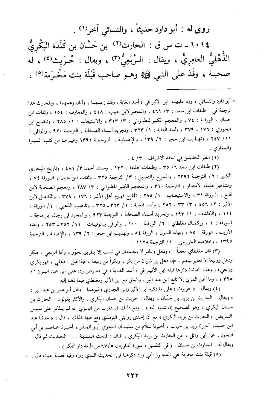 1014 ت س ق: الحارث بن حسان بن كلدة البكري الذهلي العامري (2) ، ويُقال: الربعي (3) ، ويُقال: حريث (4) ، لهُ صُحبَةٌ، وفد على النَّبِيّ صَلَّى اللَّهُ عليه وسلم وهو صاحب قيلة بنت مخرمة (5) ،