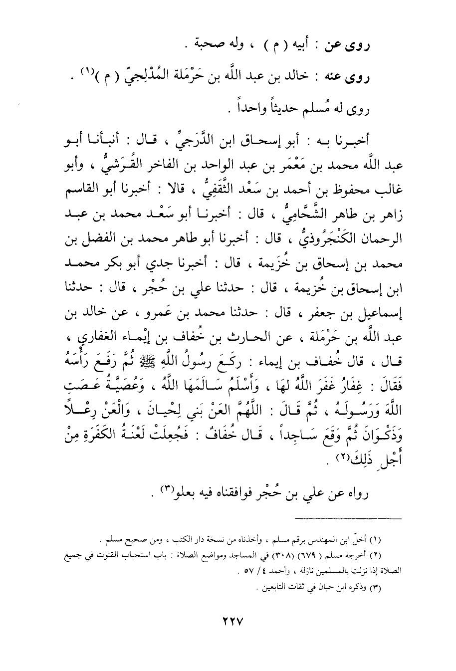 أخبرنا بِهِ: أَبُو إِسْحَاقَ ابْنُ الدَّرَجِيِّ، قال: أَنْبَأَنَا أَبُو عَبد اللَّهِ مُحَمَّدُ بْنُ مَعْمَرِ بن عبد الواحد بن الفاجر الْقُرَشِيُّ، وأَبُو غَالِبٍ مَحْفُوظُ بْنُ أَحْمَدَ بْنِ سَعْدٍ الثَّقَفِيُّ، قَالا: أَخْبَرَنَا أَبُو الْقَاسِمِ زَاهِرُ بْنُ طَاهِرٍ الشَّحَّامِيُّ، قال: أَخْبَرَنَا أَبُو سَعْدٍ مُحَمَّدُ بْنُ عَبْدِ الرَّحْمَنِ الْكَنْجَرُوذِيُّ، قال: أَخْبَرَنَا أَبُو طَاهِرٍ مُحَمَّدُ بْنُ الْفَضْلِ بْنِ مُحَمَّدِ بْن إسحاق بْن خزيمة، قال: أَخْبَرَنَا جَدِّي أَبُو بَكْرٍ مُحَمَّدُ إبن إِسْحَاقَ بْنِ خُزَيْمَةَ، قال: حَدَّثَنَا عَلِيُّ بْنُ حُجْرٍ، قال: حَدَّثَنَا إِسْمَاعِيلُ بْنُ جَعْفَرٍ، قال: حَدَّثَنَا مُحَمَّدُ بْنُ عَمْرو، عَنْ خَالِدِ بْن عَبد اللَّهِ بْن حرملة، عَنِ الْحَارِثِ بْنِ خُفَافِ بْنِ إِيمَاءَ الْغِفَارِيِّ، قال، قال خُفَافُ بْنُ إِيمَاءَ: رَكَعَ رَسُولُ اللَّهِ صَلَّى اللَّهُ عَلَيْهِ وسَلَّمَ ثُمَّ رَفَعَ رَأْسَهُ فَقَالَ: غِفَارُ غَفَرَ اللَّهُ لَهَا، وأَسْلَمُ سَالَمَهَا اللَّهُ، وعُصَيَّةُ عَصَتِ اللَّهَ ورَسُولَهُ، ثُمَّ قال: اللَّهُمَّ الْعَنْ بَنِي لِحْيَانَ، والْعَنْ رَعْلا وذَكْوَانَ ثُمَّ وقَعَ سَاجِدًا، قال خُفَافٌ: فَجُعِلَتْ لَعْنَةُ الْكَفَرَةِ مِنْ أَجْلِ ذَلِكَ (2) .