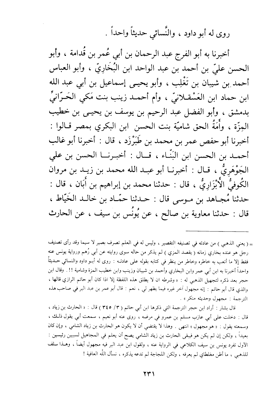 = (يعني الذهبي) من عادته في تصنيفه التقصير، وليس له في العلم تصرف بصير لا سيما وقد رأى تصنيف رجل هو عنده بخاري زمانه (يقصد المزي) لم يذكر من حاله سوى روايته عَن أبي رهم ورواية يونس عنه فقط إلا ما أتعب به خاطره وخاطر من ينظر في كتابه بقوله على عادته: روى له أَبُو داود والنَّسَائي حديثًا واحدًا أخبرنا به ابن أَبي عَمْرو ابْنُ الْبُخَارِيِّ وأَحْمَدُ بْنُ شَيْبَانَ وزينب وابن خطيب المزة وشامية!. وَقَال ابن حجر بعد ذكره لتجهيل الذهبي له: وشرطه ان لا يطلق هذه اللفظة إلا إذا كان أبو حاتم الرازي قالها، والذي قال أبو حاتم: إنه مجهول آخر غيره فيما يظهر لي، نعم: قال أَبُو عُمَر بْن عَبد الْبَرِّ في صاحب هذه الترجمة: مجهول وحديثه منكر". قال بشار: أراد ابن حجر الترجمة التي ذكرها ابن أَبي حاتم (3 / 345) قال: الحارث بن زياد، قال: دخلت على أبي عازب مسلم بن عَمْرو في مرضه، روى عنه أبو نعيم، سمعت أبي يقول ذلك، وسمعته يقول: هو مجهول"انتهى. وهذا لا يقضتي أن لا يكون هو الحارث بن زياد الشامي، وإن كان بعيدا، ولكن إن لم يكن هو فيبقى الحارث بن زياد الشامي يصح أن يعلم في المجاهيل لسببين رئيسين: الاول تفرد يونس بن سيف الكلاعي في الرواية عنه، ولقول ابن عَبد الْبَرِّ فيه مجهول أيضا، وهذا سلف للذهبي، ما أظن مغلطاي لم يعرفه، ولكن اللجاجة لم تدعه يذكره، نسأل الله العافية!